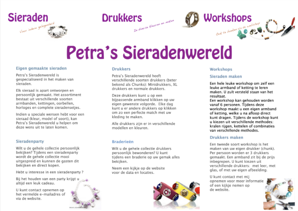 Hiernaast zie je mijn eerste flyer. Omdat ik ook op braderieën en evenementen aanwezig was, wilde ik klanten ter plaatse ook informeren over mijn producten en workshops.