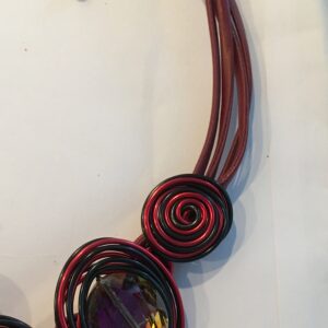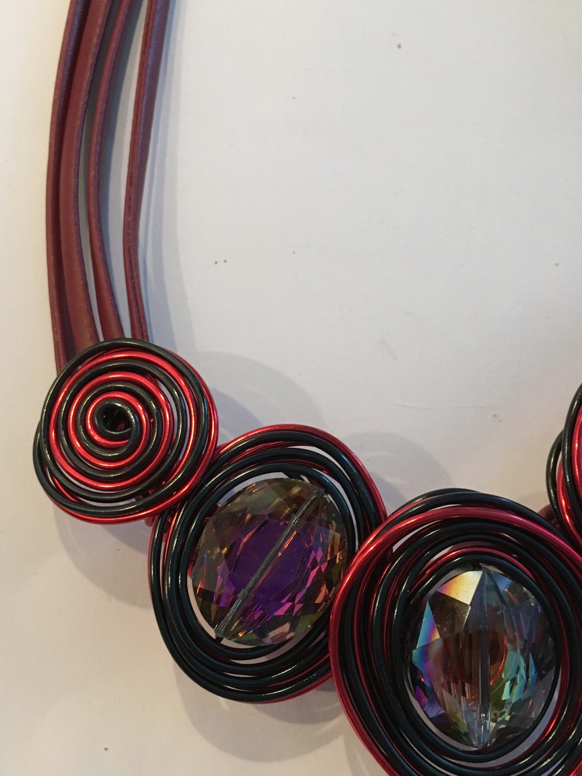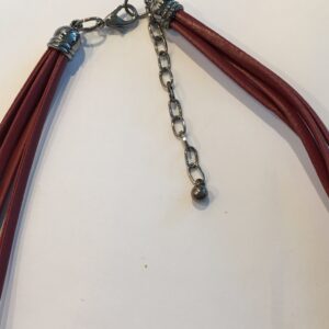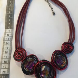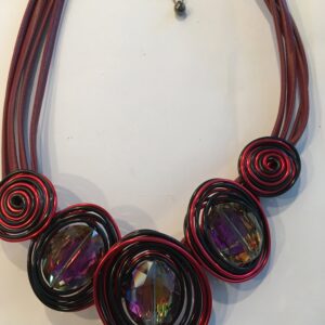 Een mooie zelfgemaakte aluminiumketting. De ketting bestaat uit 5 gevlochten ronde stenen, waarvan 3 een facetkraal in het midden hebben. De twee buitenste hebben alleen gevlochten aluminium. Alles wordt opgehangen aan een aantal strengen gekleurd leer. De ketting is afgewerkt met eindkapjes en een verlengketting, waardoor de ketting op verschillende lengtes gedragen kan worden. Aluminium bevat geen nikkel, dus ideaal voor mensen met een allergie. De eindkapjes en verlengketting zijn wel nikkelvrij en van metaal. De kettingen heb ik allemaal zelf gemaakt, dus er kunnen kleine verschillen inzitten. Pas echter wel op met parfum, dit bijt uit en kan de kleur van het aluminium aantasten, waardoor de ketting kaal kan worden.