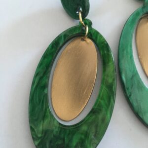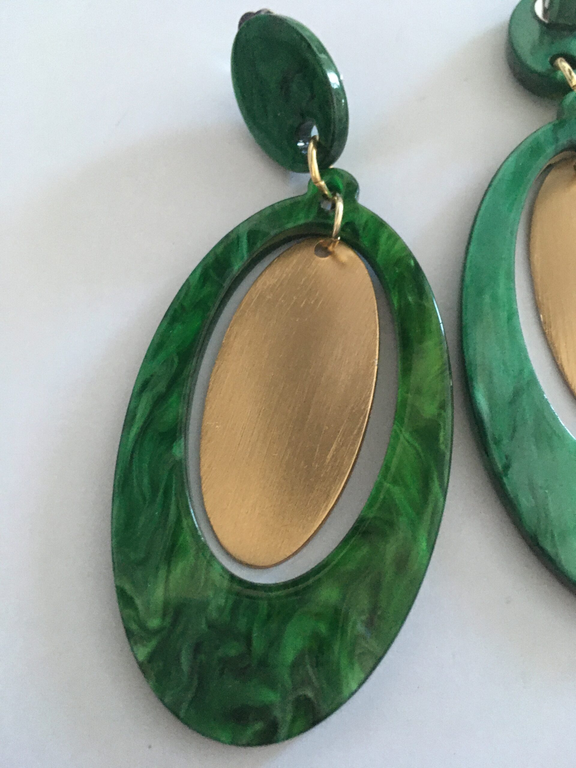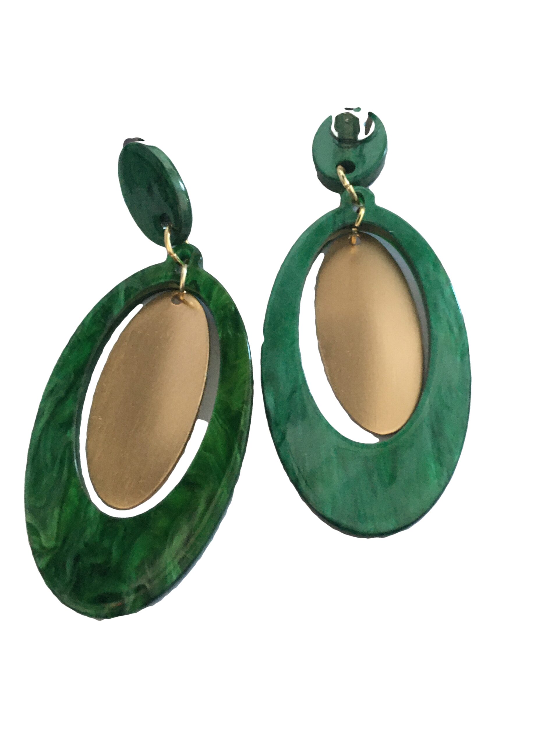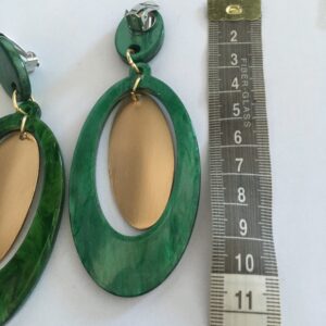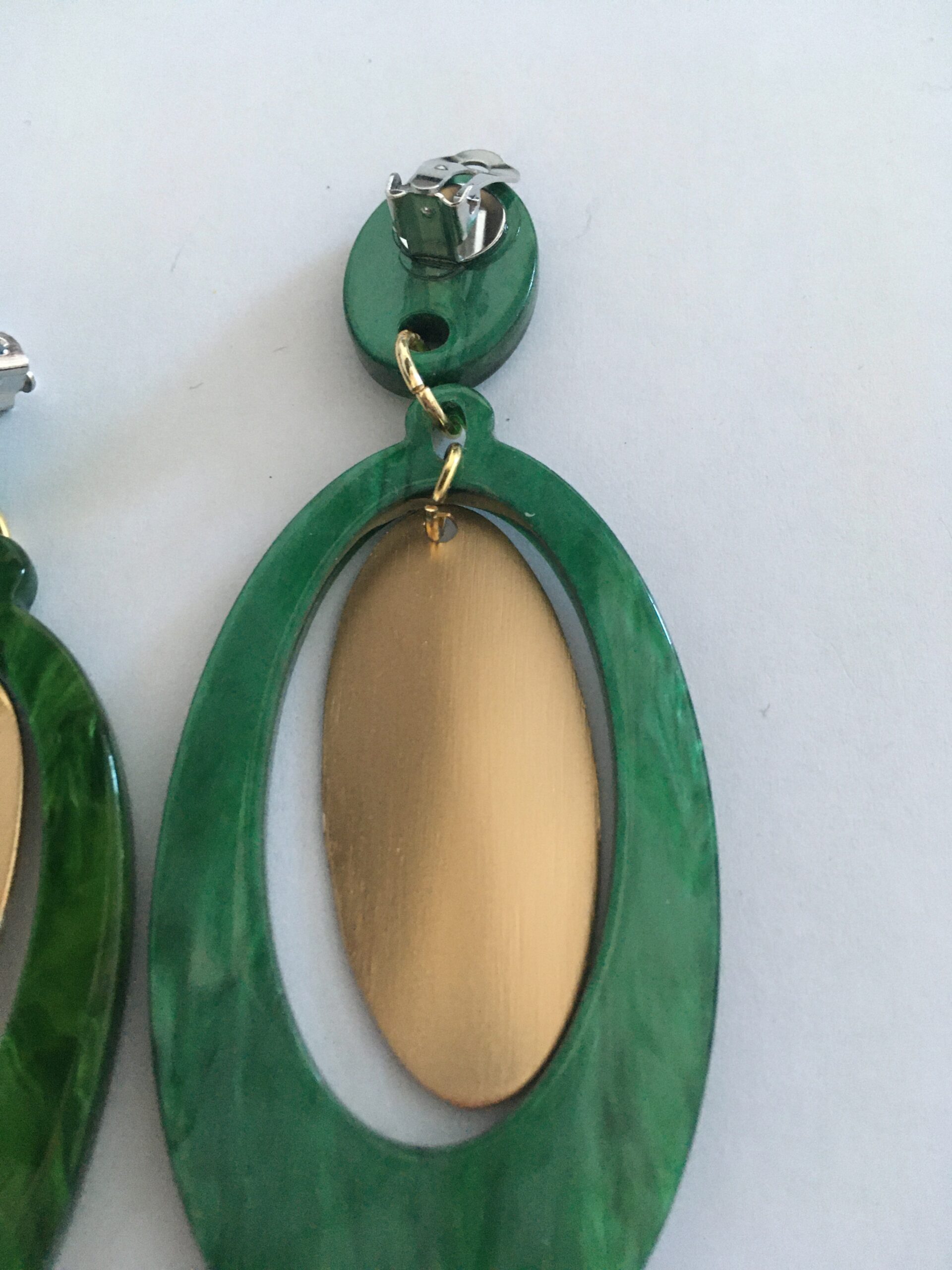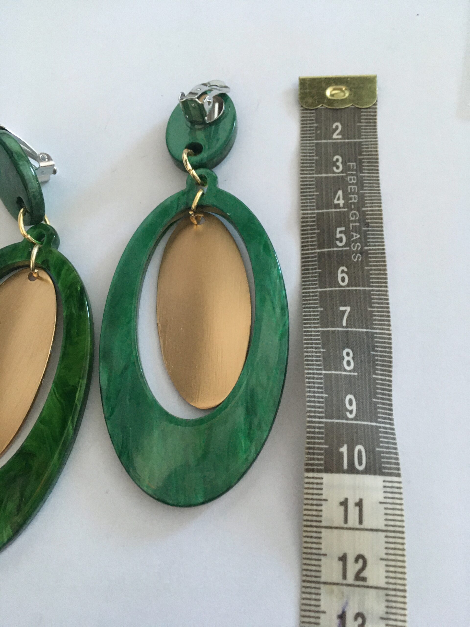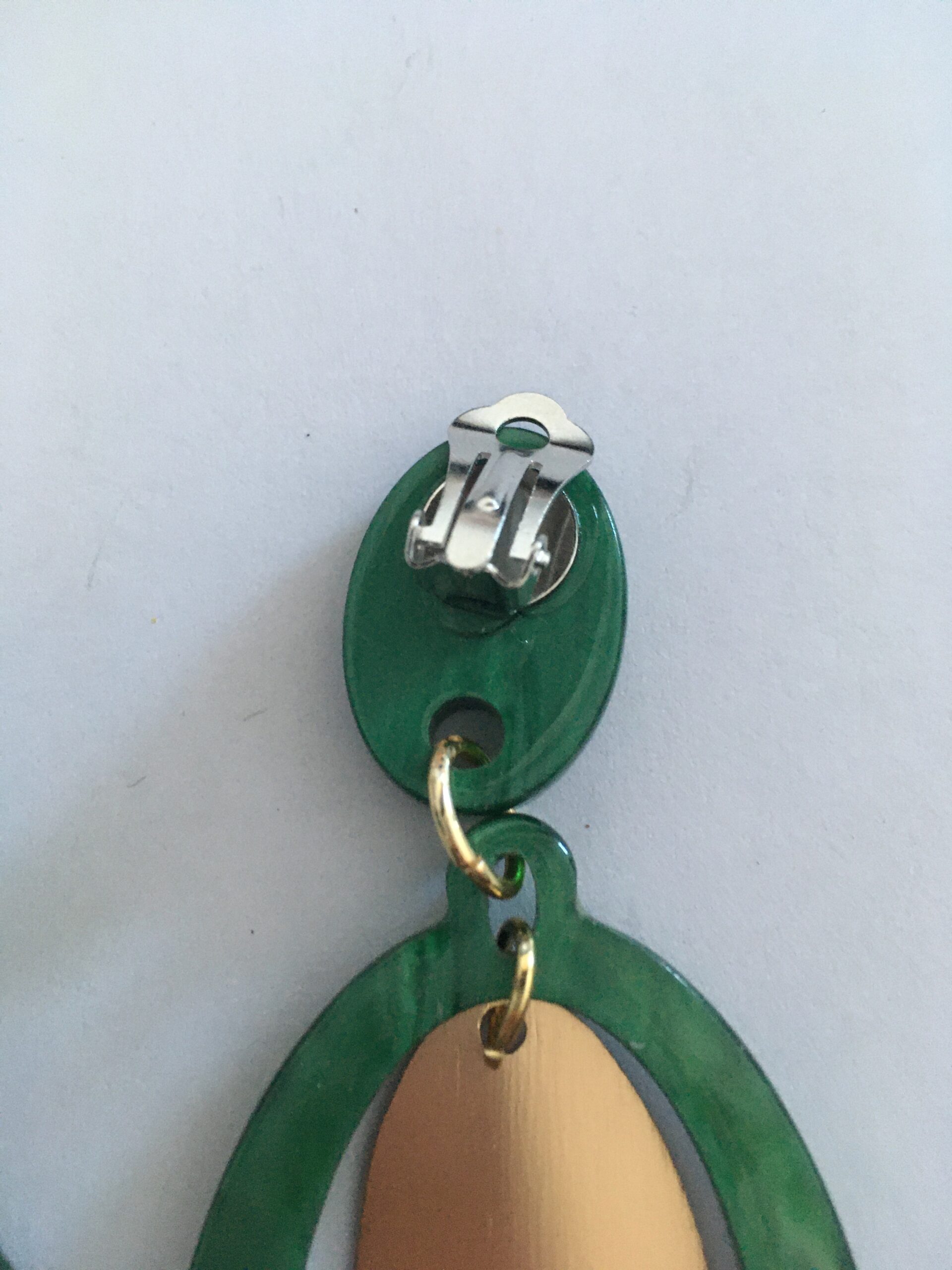 Een paar hele mooie groene hangende clipoorbellen. De oorbel heeft een beetje een parelmoer gloed.Let op, dit zijn clipoorbellen. U heeft geen gaatjes nodig voor deze oorbellen. De oorbel is ongeveer 10 cm lang en is van kunststof. De oorbel bestaat uit twee delen: een groen ovaal rondje waar de clip aanzit en de druppel die dezelfde kleur groen is. De druppel is open in het midden en in het midden hangt een goudkleurig plaatje, welke precies in het rondje past.De oorbel is nikkelvrij.De oorbellen worden verzegeld verstuurd, zodra deze verzegeling is verbroken, mogen de oorbellen niet meer geretourneerd of geruild worden.Het is echt een paar mooie oorbellen welke zowel sjiek als modern gedragen kunnen worden.