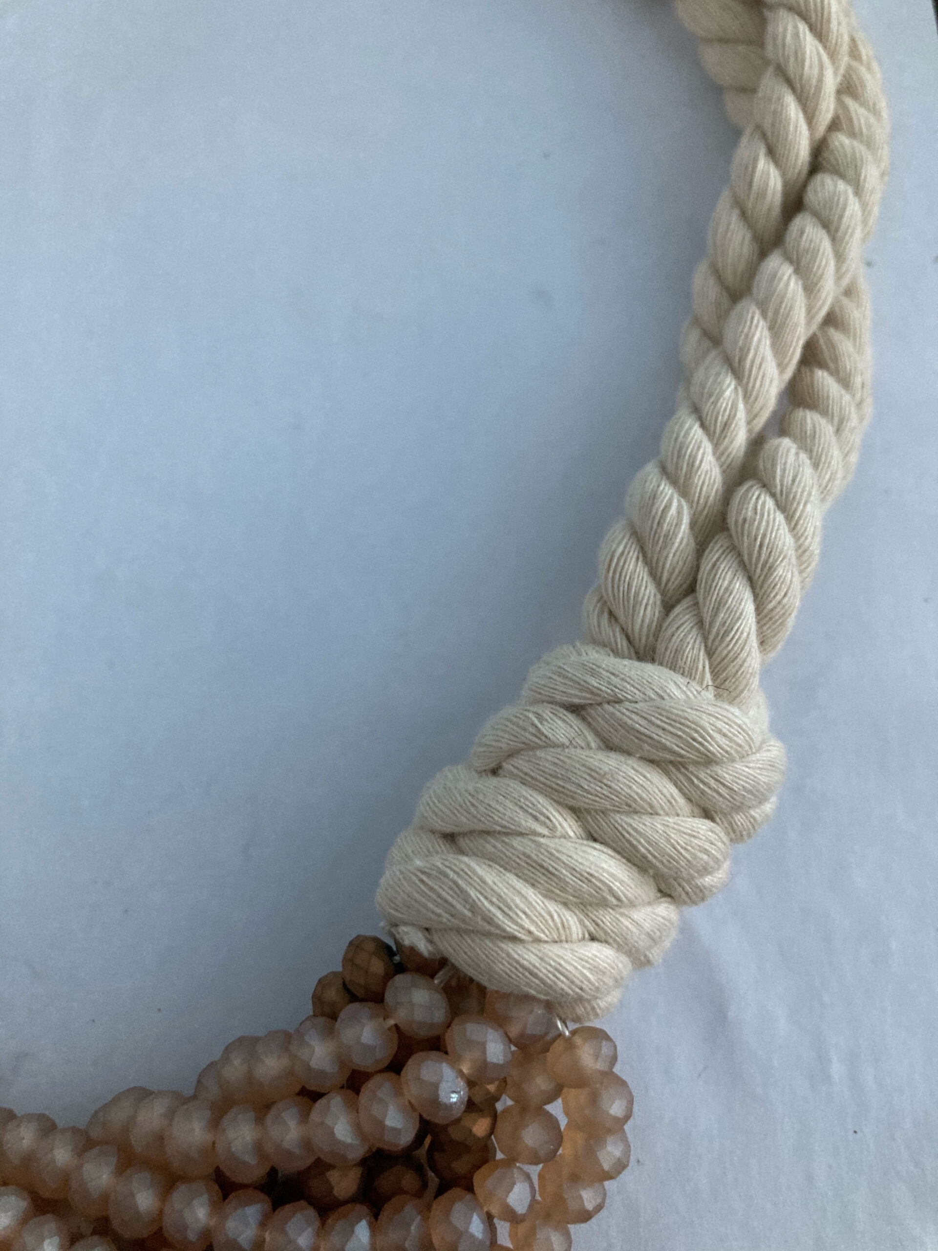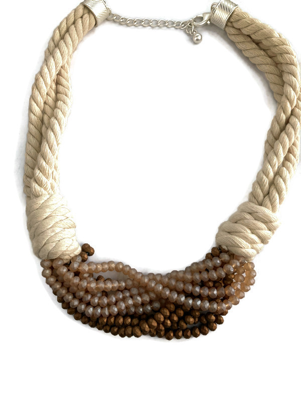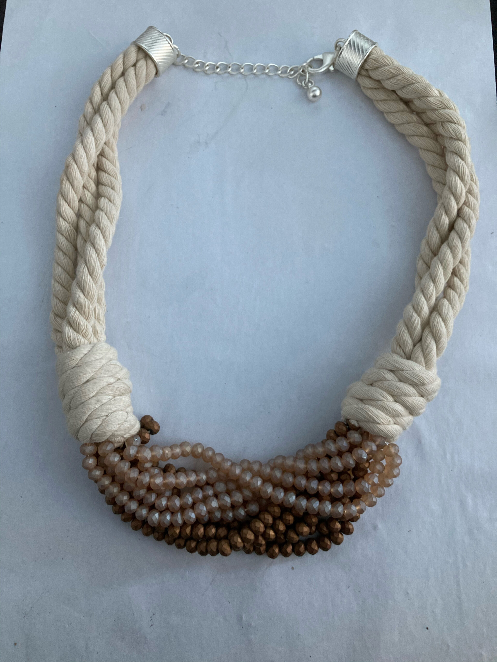 Een hele mooie zelfgemaakte ketting met beige touw. Tussen het touw heb ik 10 laagjes met 2 kleuren facetkraaltjes gebonden. Aan beide kanten zitten 3 strengen beige touw. De ketting sluit met een aluminium sluiting met verlengketting.De ketting is 49 cm lang zonder verlengketting. Met verlengketting is de ketting 59 cm.Het is een zeer comfortabele ketting om te dragen, vanwege het lichte touw.Deze ketting kan zowel casual als voor speciale gelegenheden gedragen worden.Pas echter wel op met parfum, dit kan uitbijten en kale plekken achterlaten.