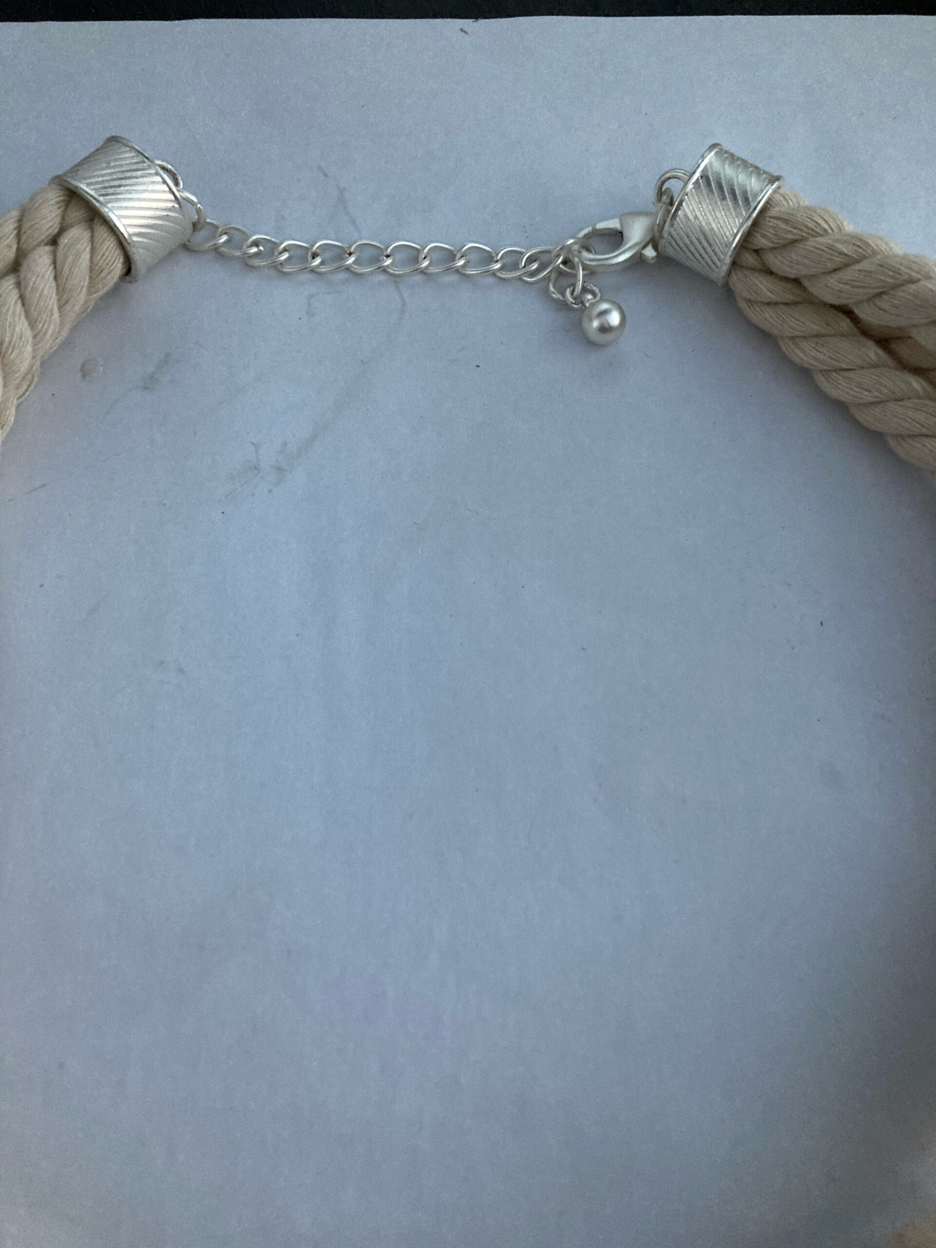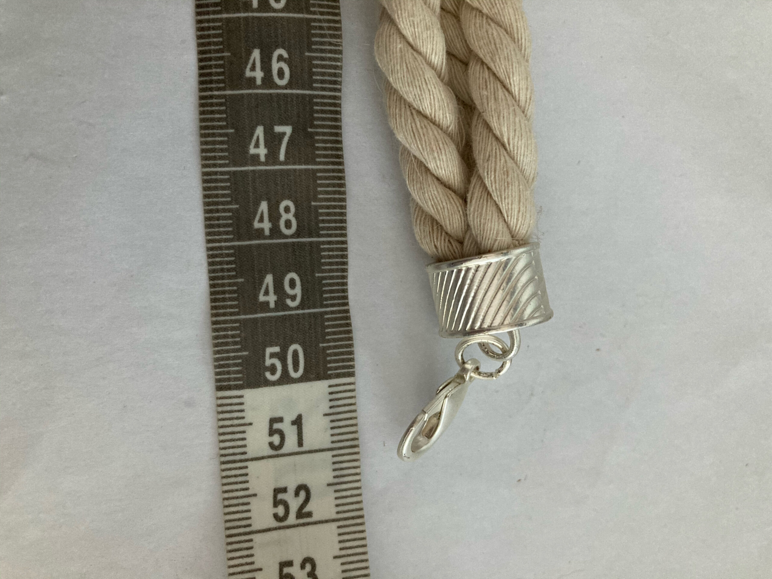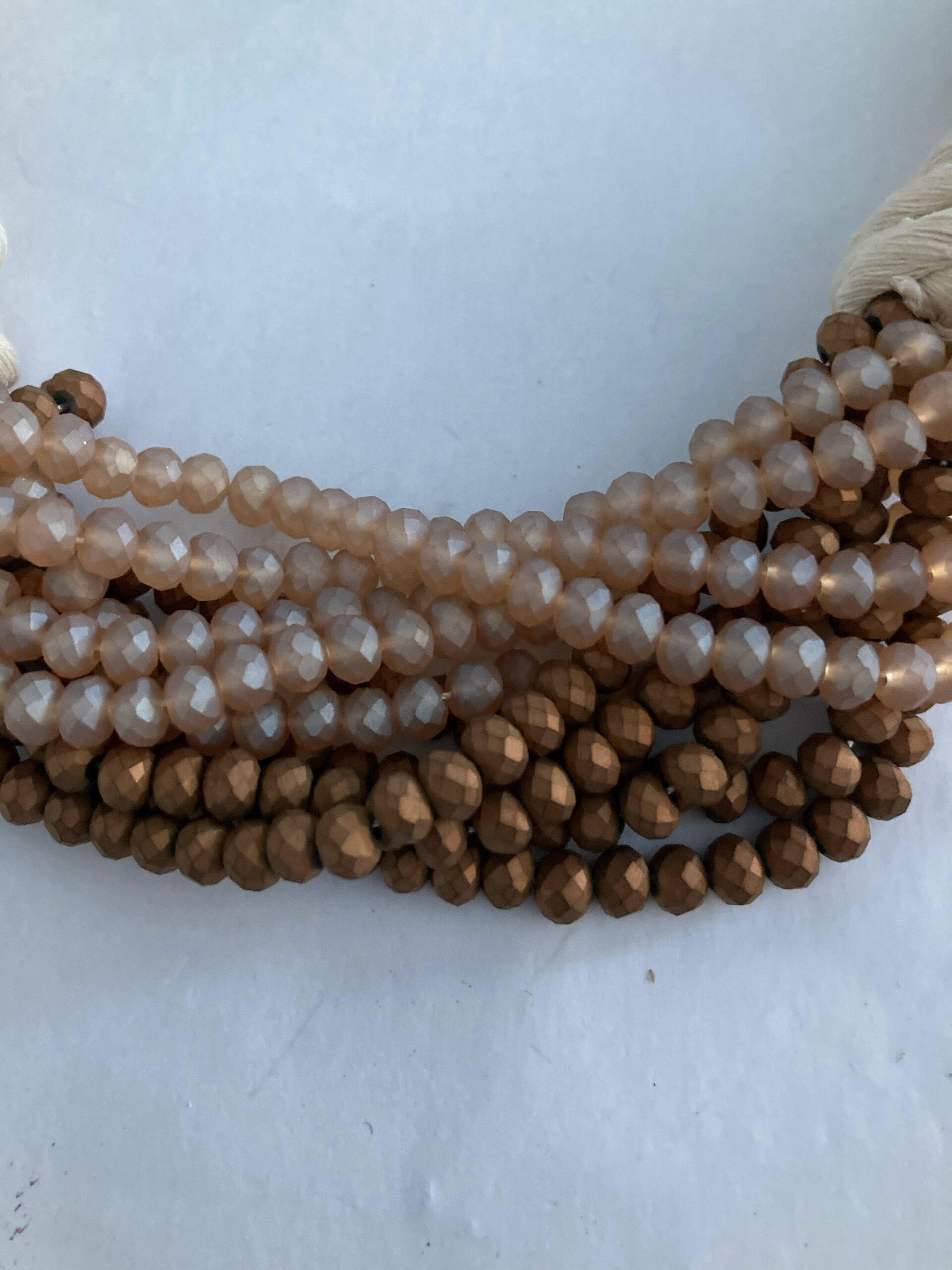 Een hele mooie zelfgemaakte ketting met beige touw. Tussen het touw heb ik 10 laagjes met 2 kleuren facetkraaltjes gebonden. Aan beide kanten zitten 3 strengen beige touw. De ketting sluit met een aluminium sluiting met verlengketting.De ketting is 49 cm lang zonder verlengketting. Met verlengketting is de ketting 59 cm.Het is een zeer comfortabele ketting om te dragen, vanwege het lichte touw.Deze ketting kan zowel casual als voor speciale gelegenheden gedragen worden.Pas echter wel op met parfum, dit kan uitbijten en kale plekken achterlaten.