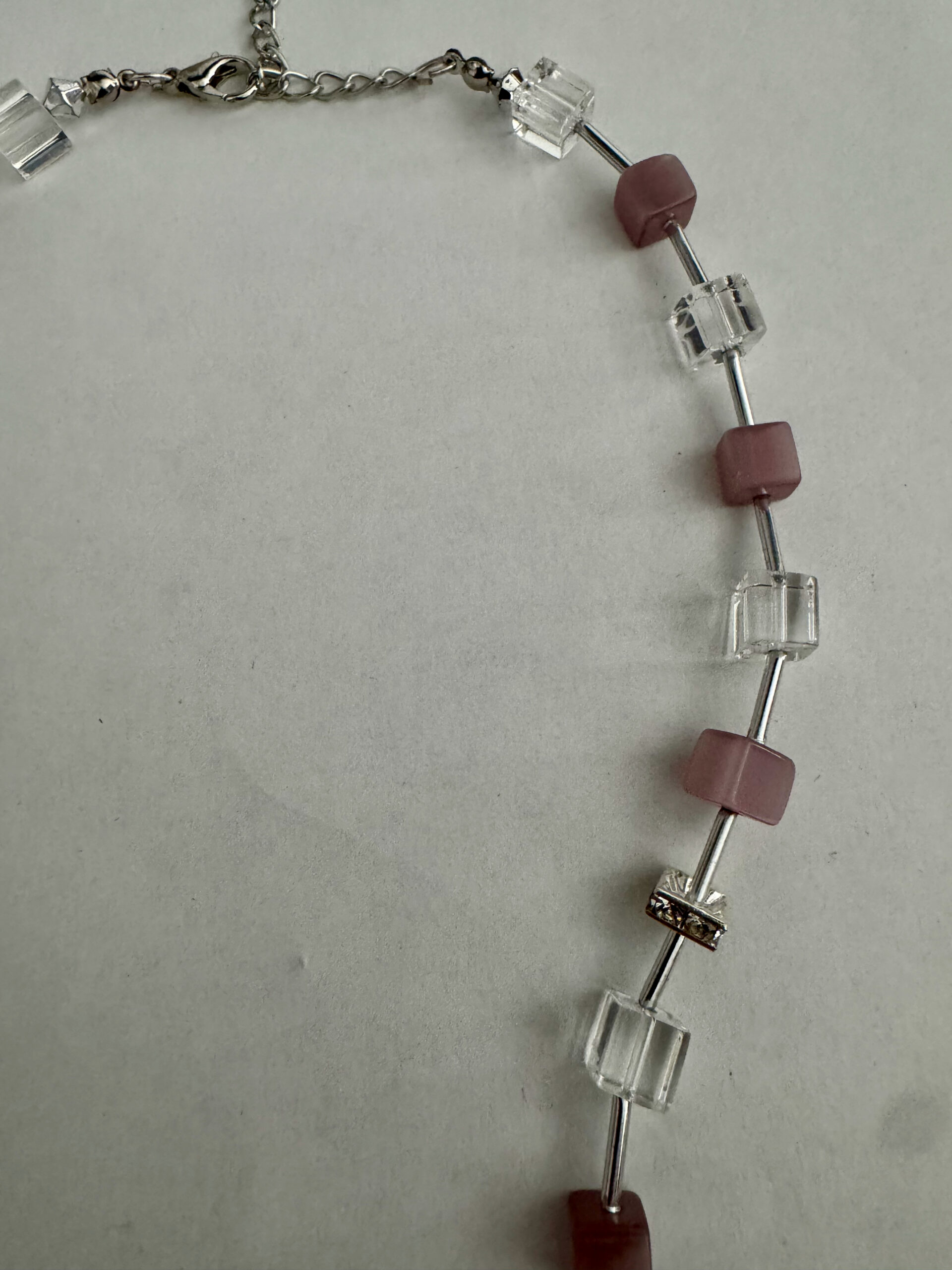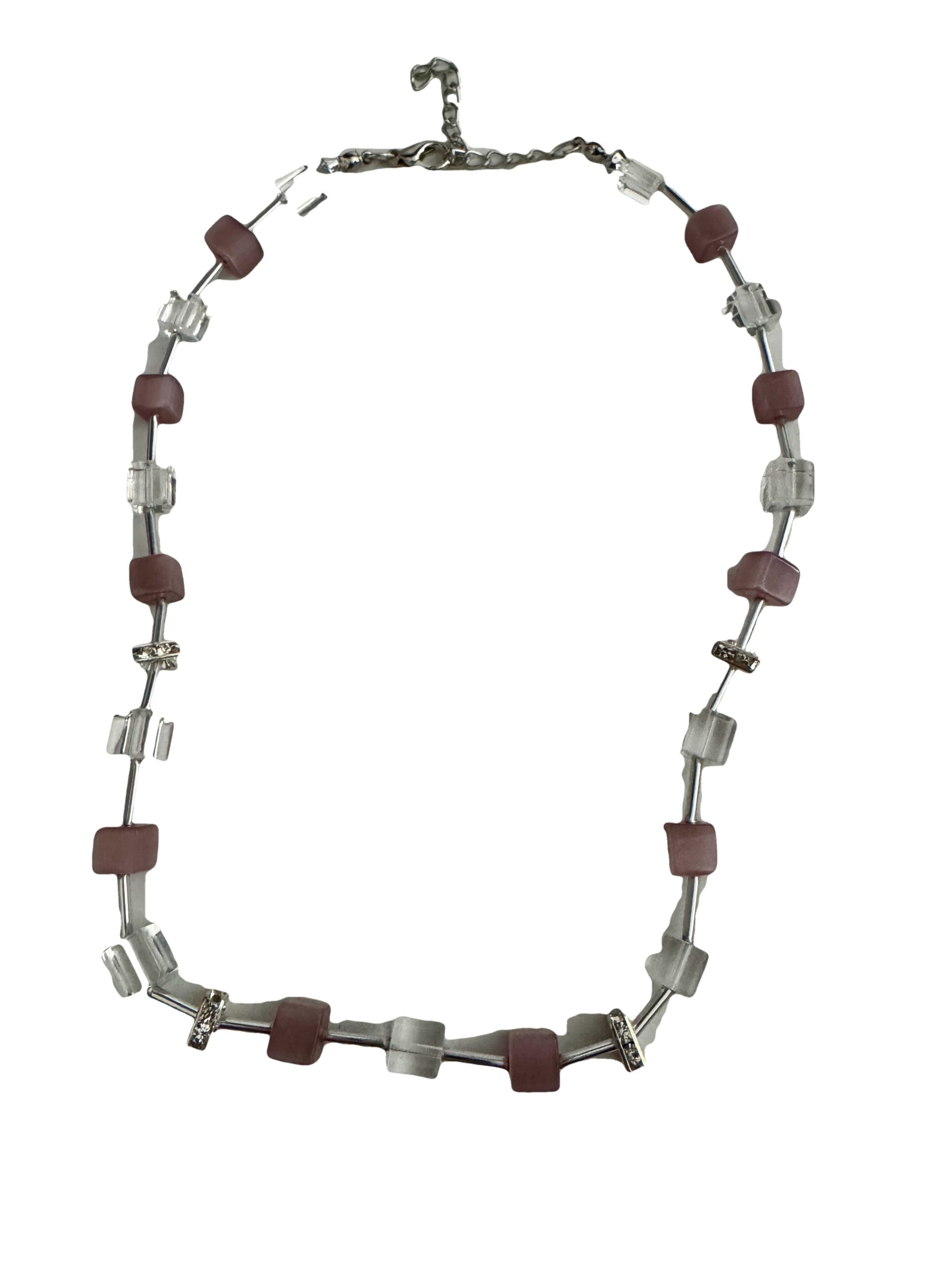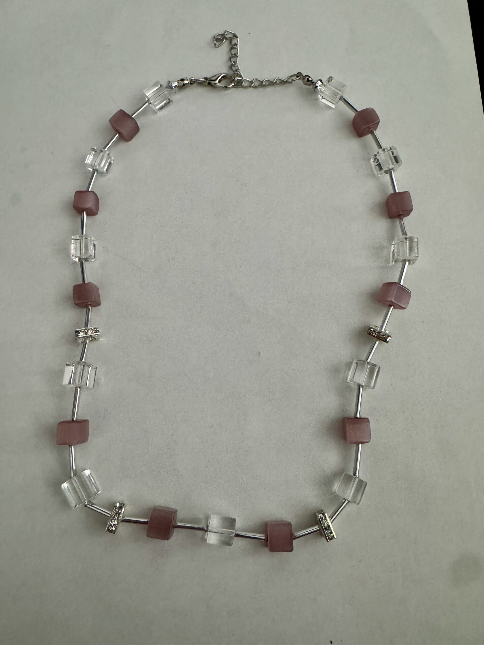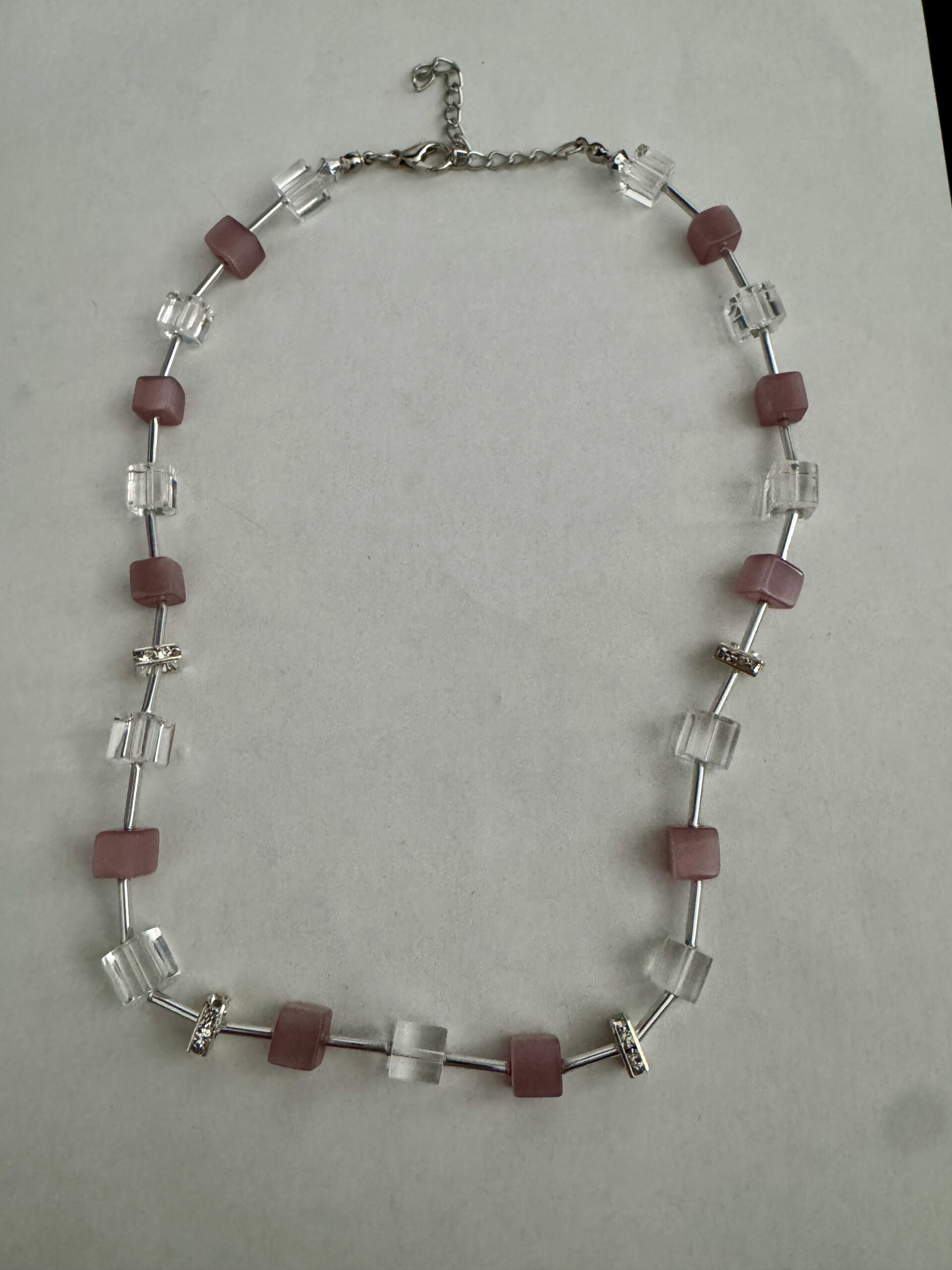 Een mooie zelfgemaakte ketting met blokjes en buisjes. De blokjes zijn roze en transparant. Tussen de blokjes zitten buisjes, waardoor de blokjes een zwevend idee krijgen. Alle metalen onderdelen zijn nikkelvrij. De lengte van de ketting is 45 cm en heeft een verlengketting van 7,5 cm. Door deze verlengketting kunt u de ketting op verschillende standen dragen en is ook geschikt voor veel mensen.