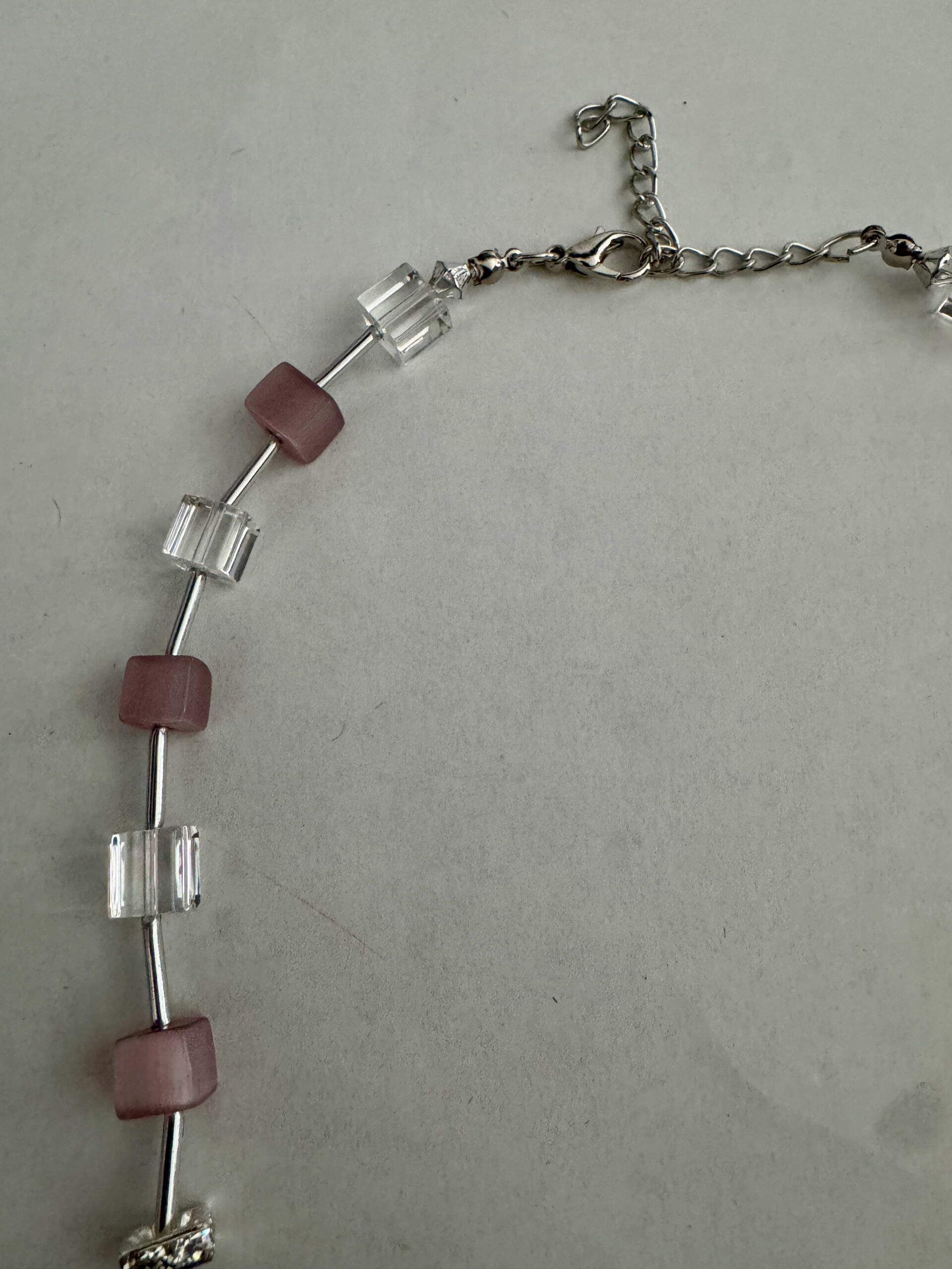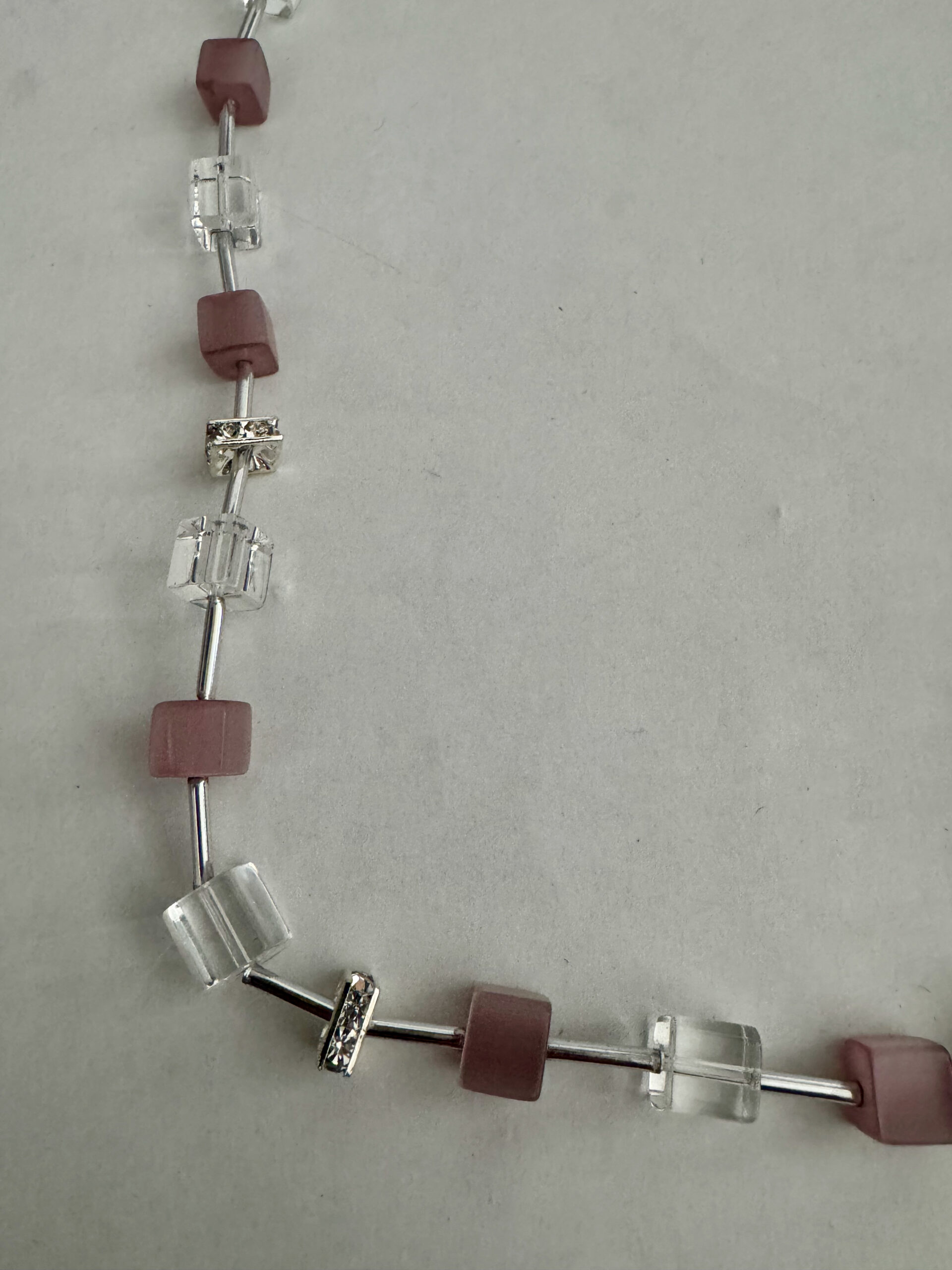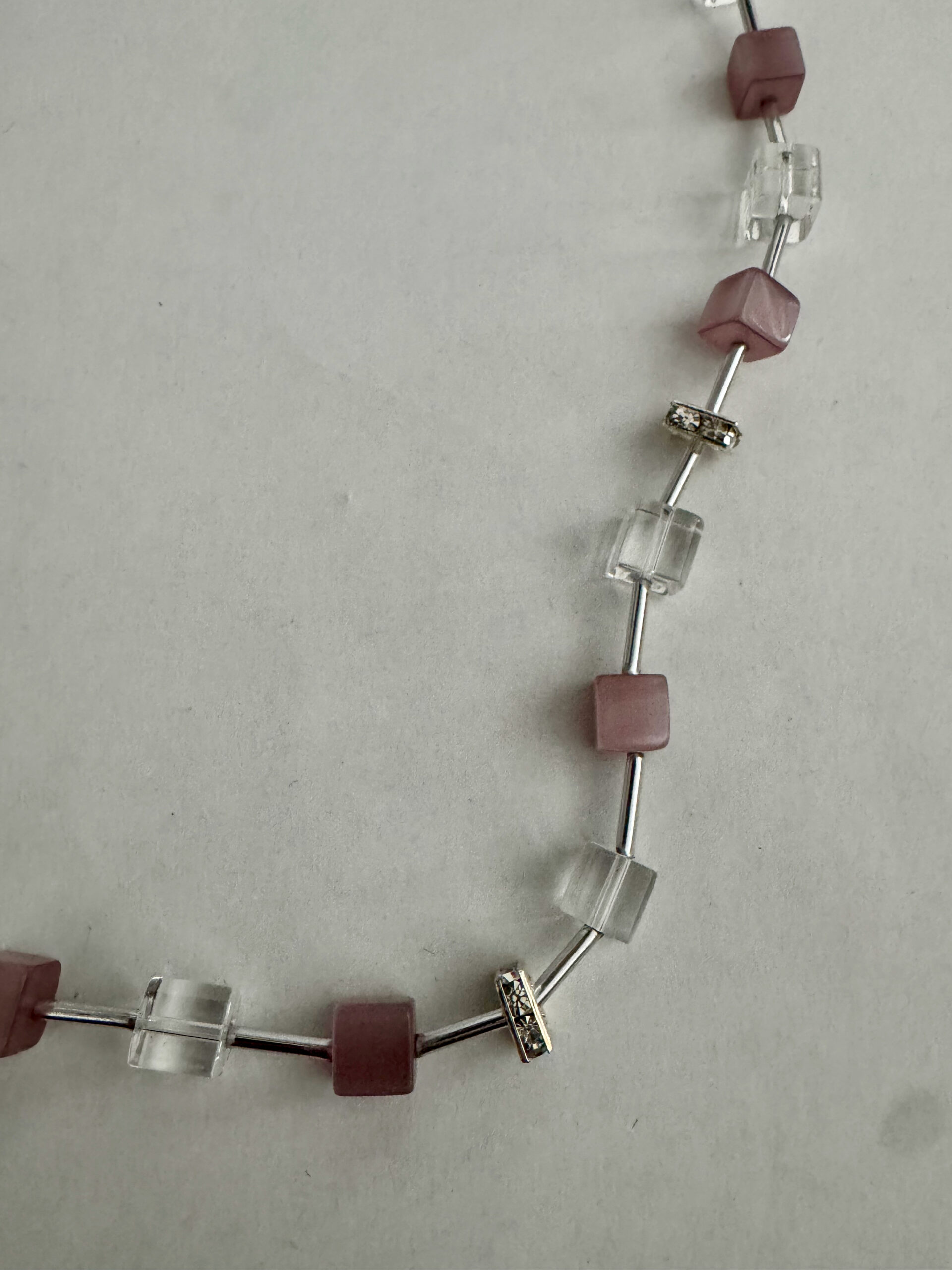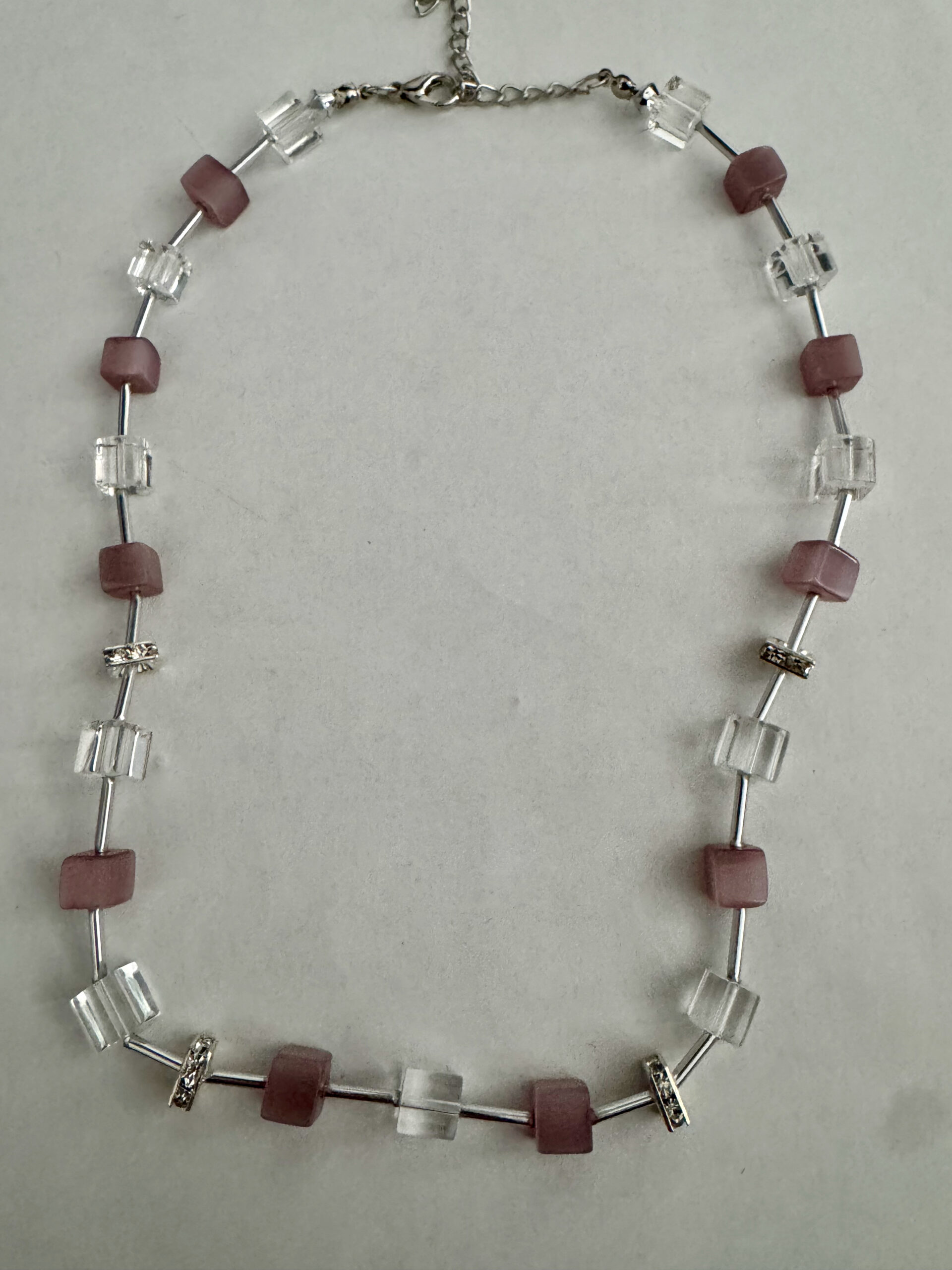 Een mooie zelfgemaakte ketting met blokjes en buisjes. De blokjes zijn roze en transparant. Tussen de blokjes zitten buisjes, waardoor de blokjes een zwevend idee krijgen. Alle metalen onderdelen zijn nikkelvrij. De lengte van de ketting is 45 cm en heeft een verlengketting van 7,5 cm. Door deze verlengketting kunt u de ketting op verschillende standen dragen en is ook geschikt voor veel mensen.