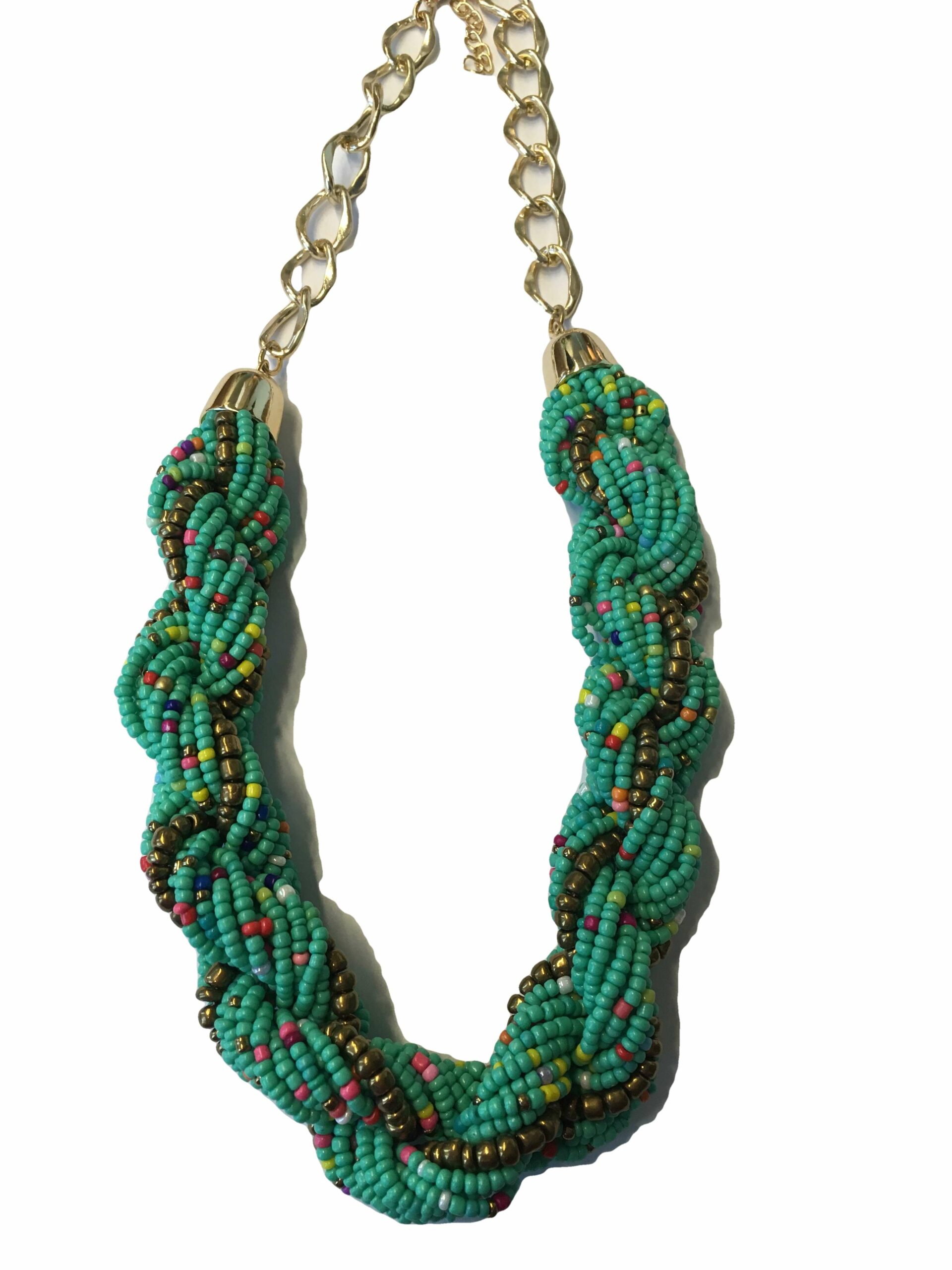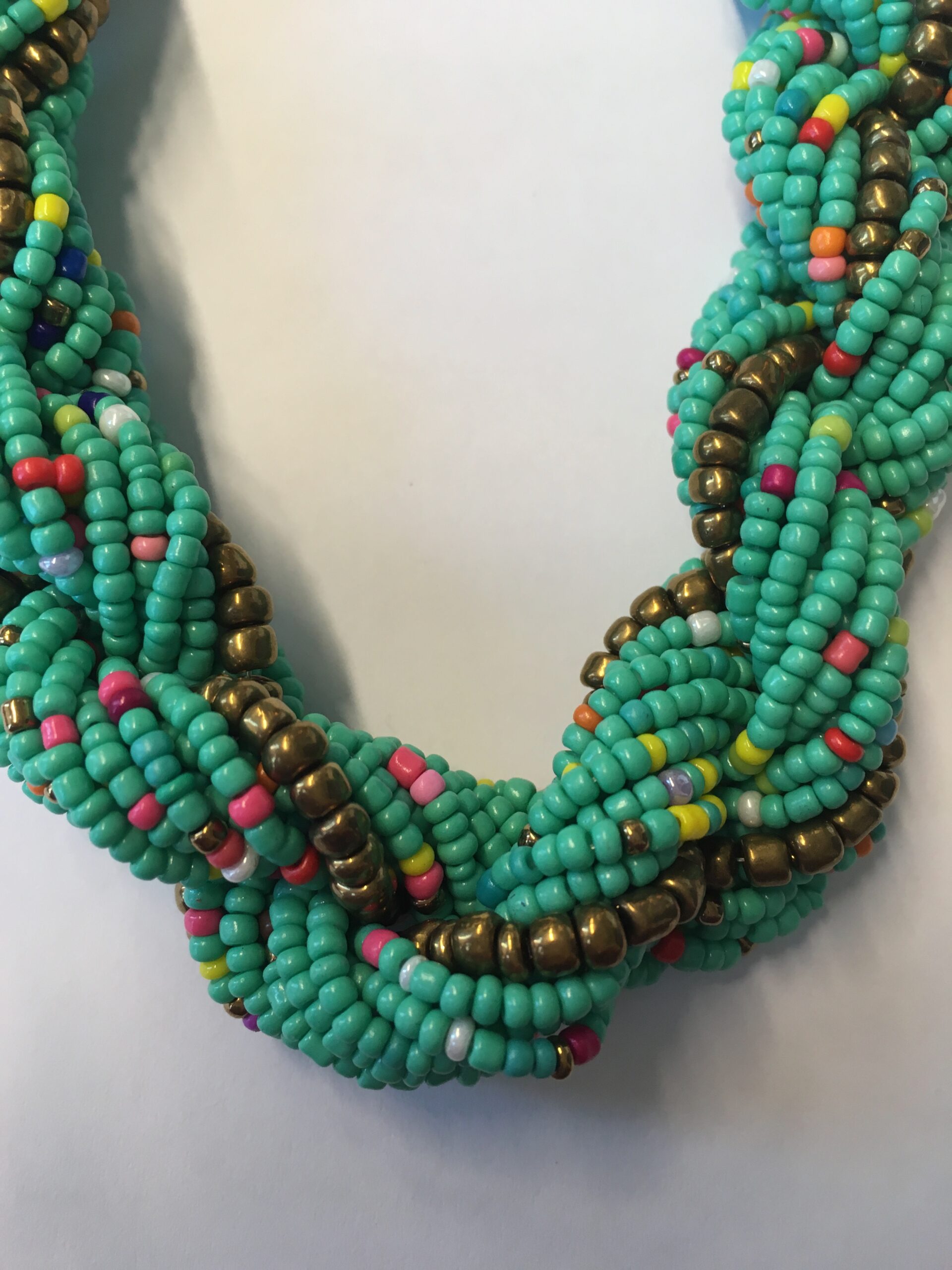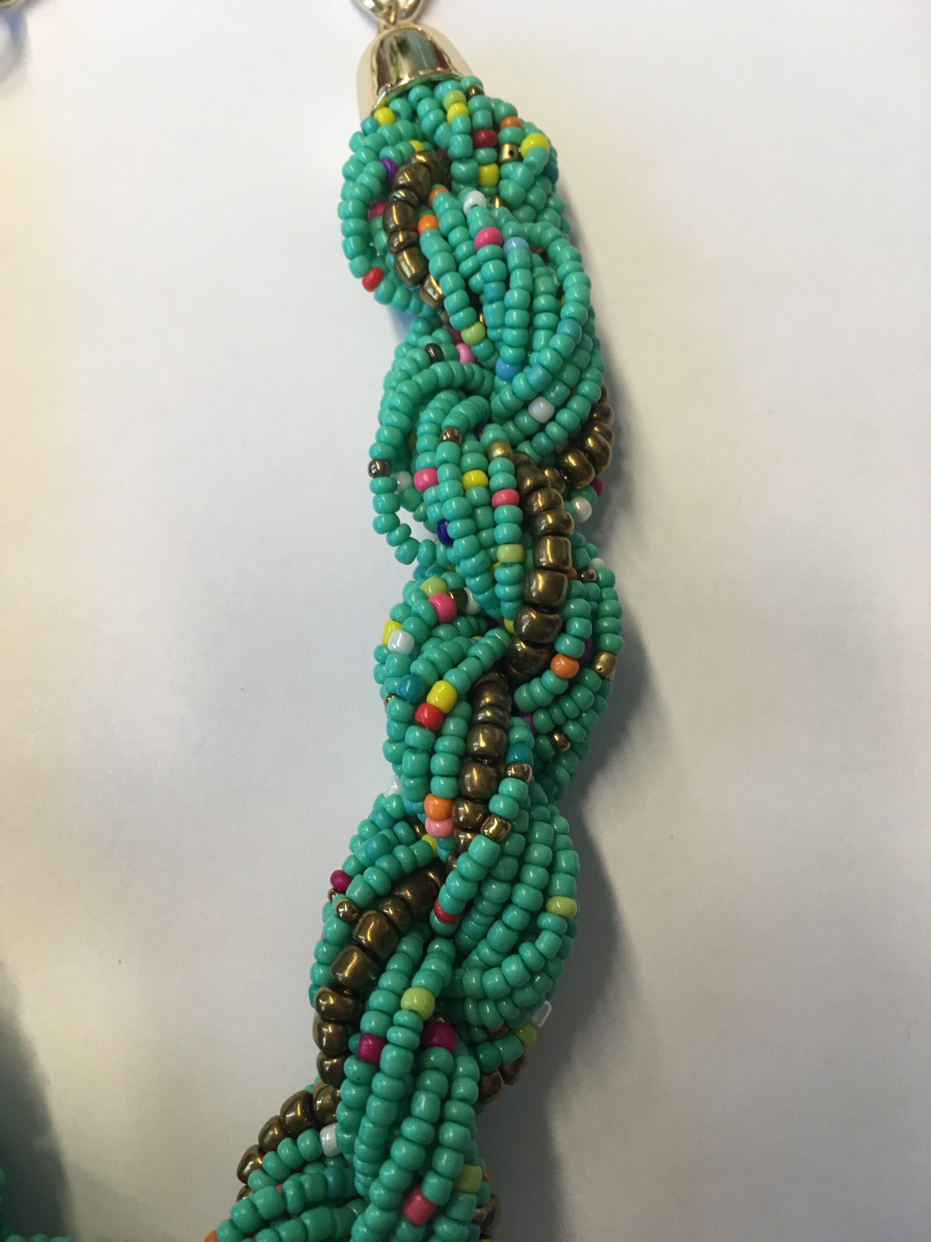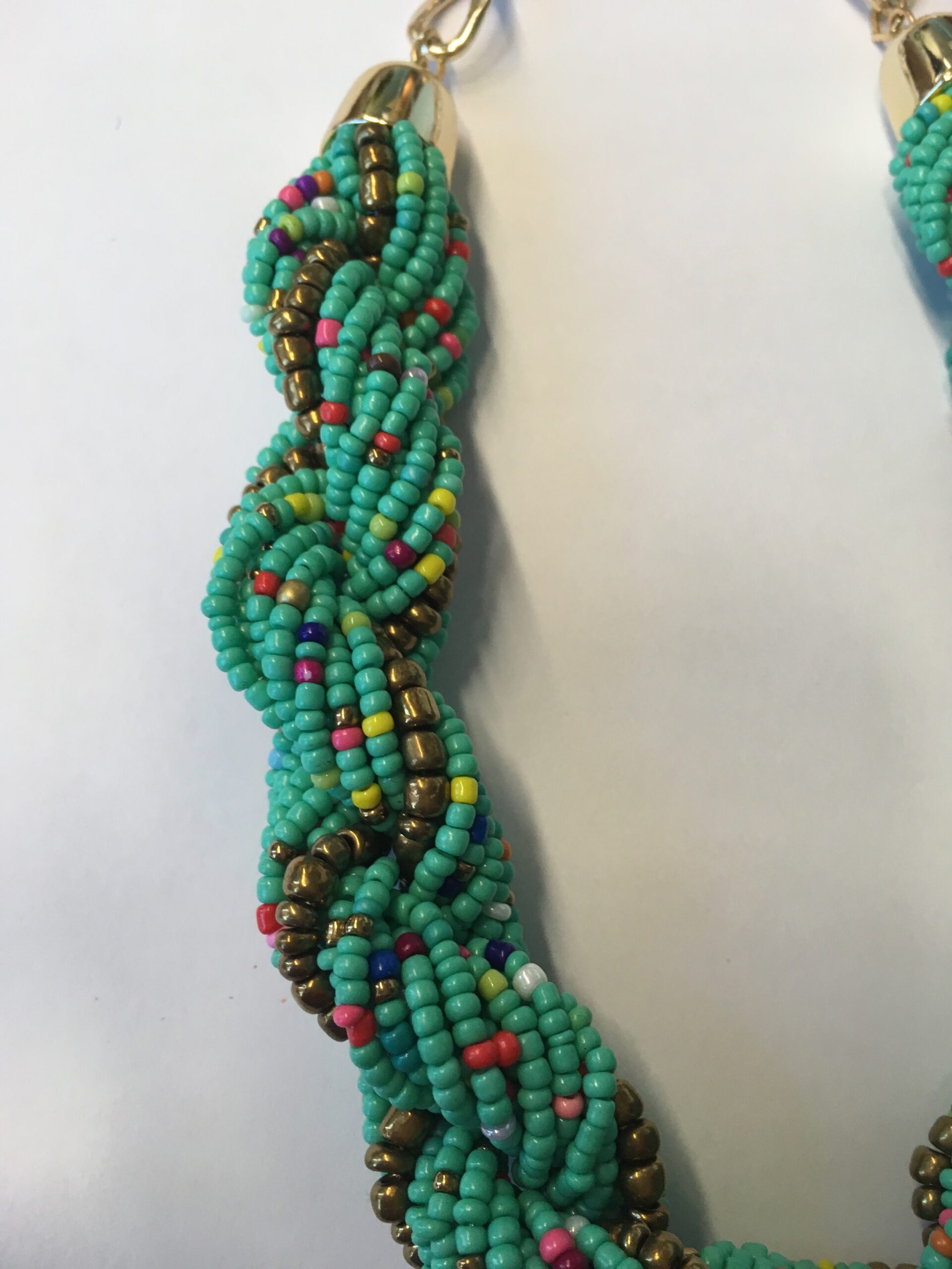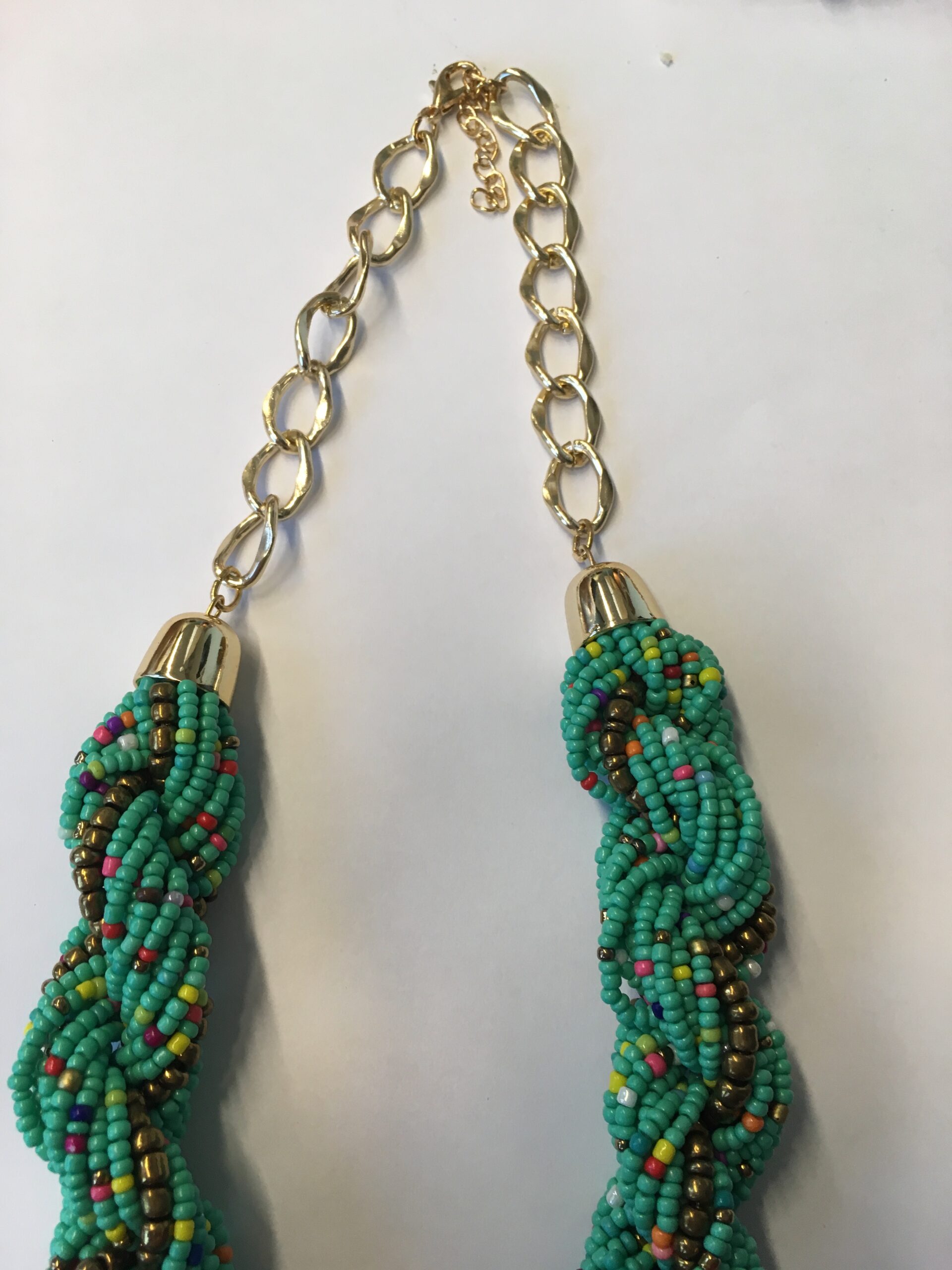 Een mooie zelfgemaakte turquoise ketting. Deze ketting heeft allemaal verschillende kleuren strengen met kraaltjes, welke tot een grote streng zijn gebonden en gedraaid vastgezet zijn. Dit geeft een heel mooi en sjiek effect. De ketting heeft een goudkleurige sluiting en heeft een verlengketting zodat deze op verschillende standen gedragen kan worden. Het is echt een hele mooie sjieke ketting, welke overal bijgedragen kan worden.Zeker in de zomer.De metalen onderdelen zijn metaal en nikkelvrij. De ketting kan zowel sjiek als casual gedragen worden.Ik heb deze ketting helemaal zelf gemaakt, dus deze zult u nergens anders vinden (behalve op mijn eigen website).Pas echter wel op met parfum, dit kan uitbijten en kale plekken achterlaten.Heeft u andere wensen of heeft u liever andere kleuren? Neem dan contact met ons op, ik kan alles voor u maken.Doordat deze handgemaakt is, kunnen de kleuren of samenstellingen iets verschillen van de foto