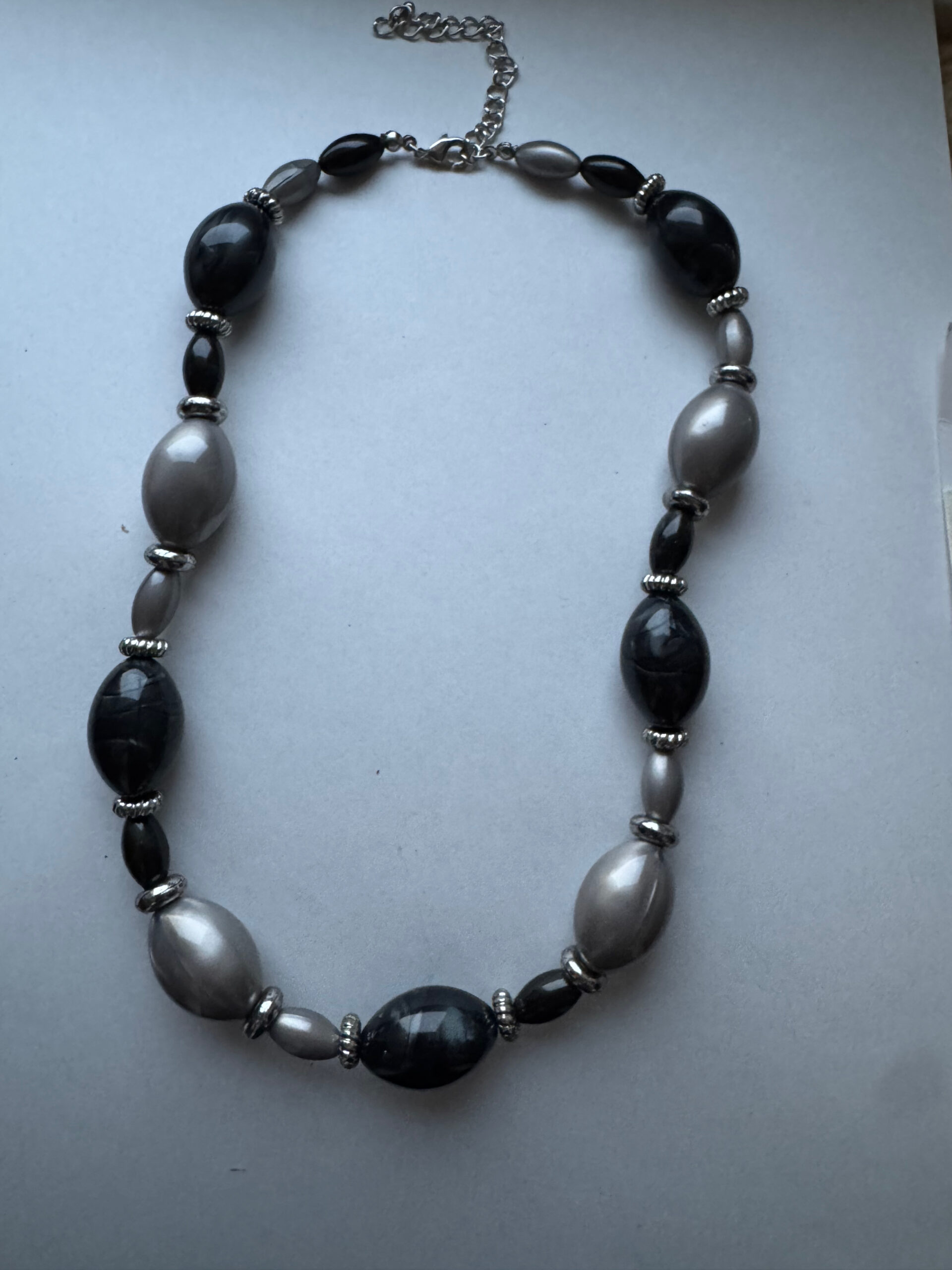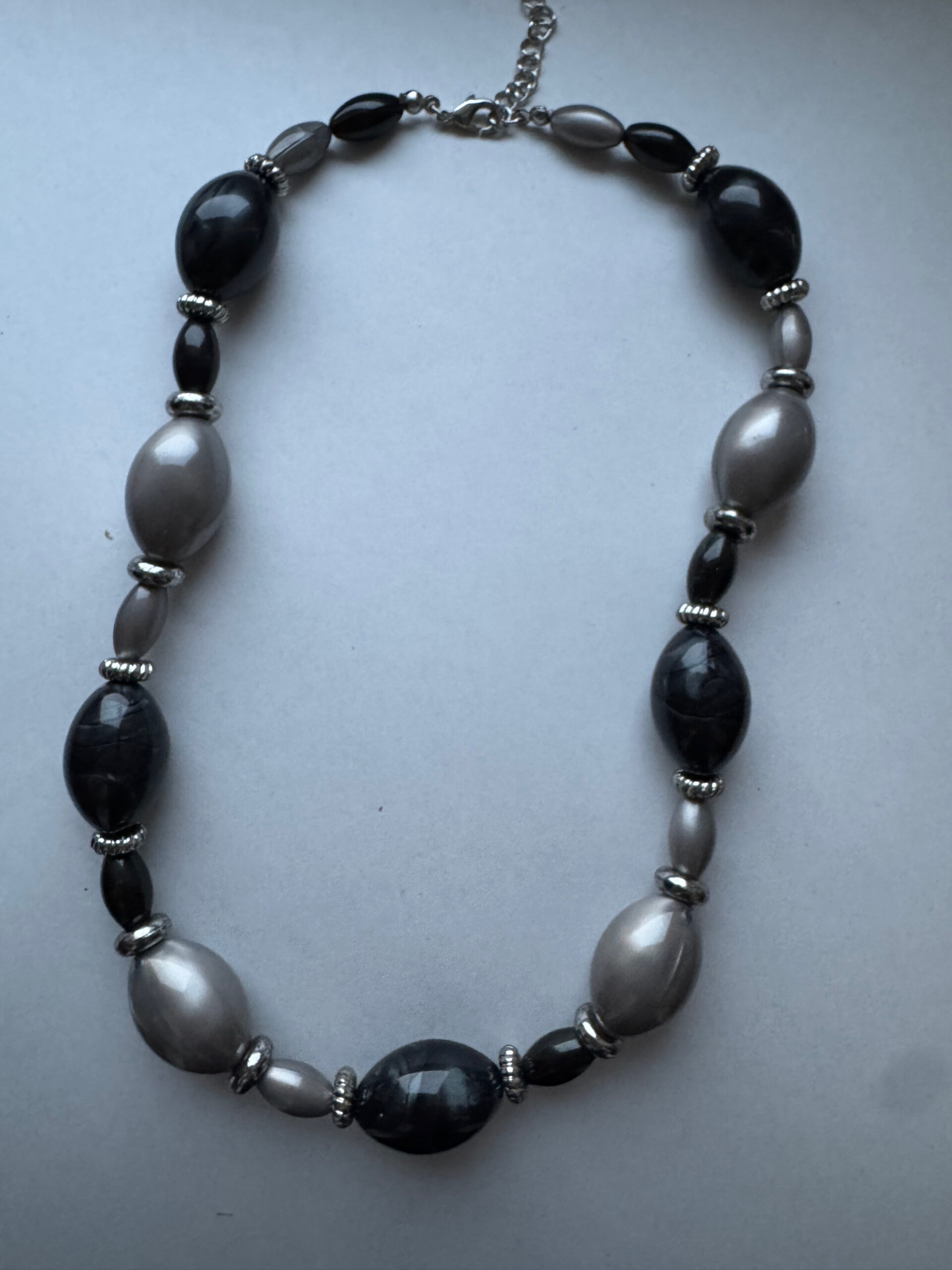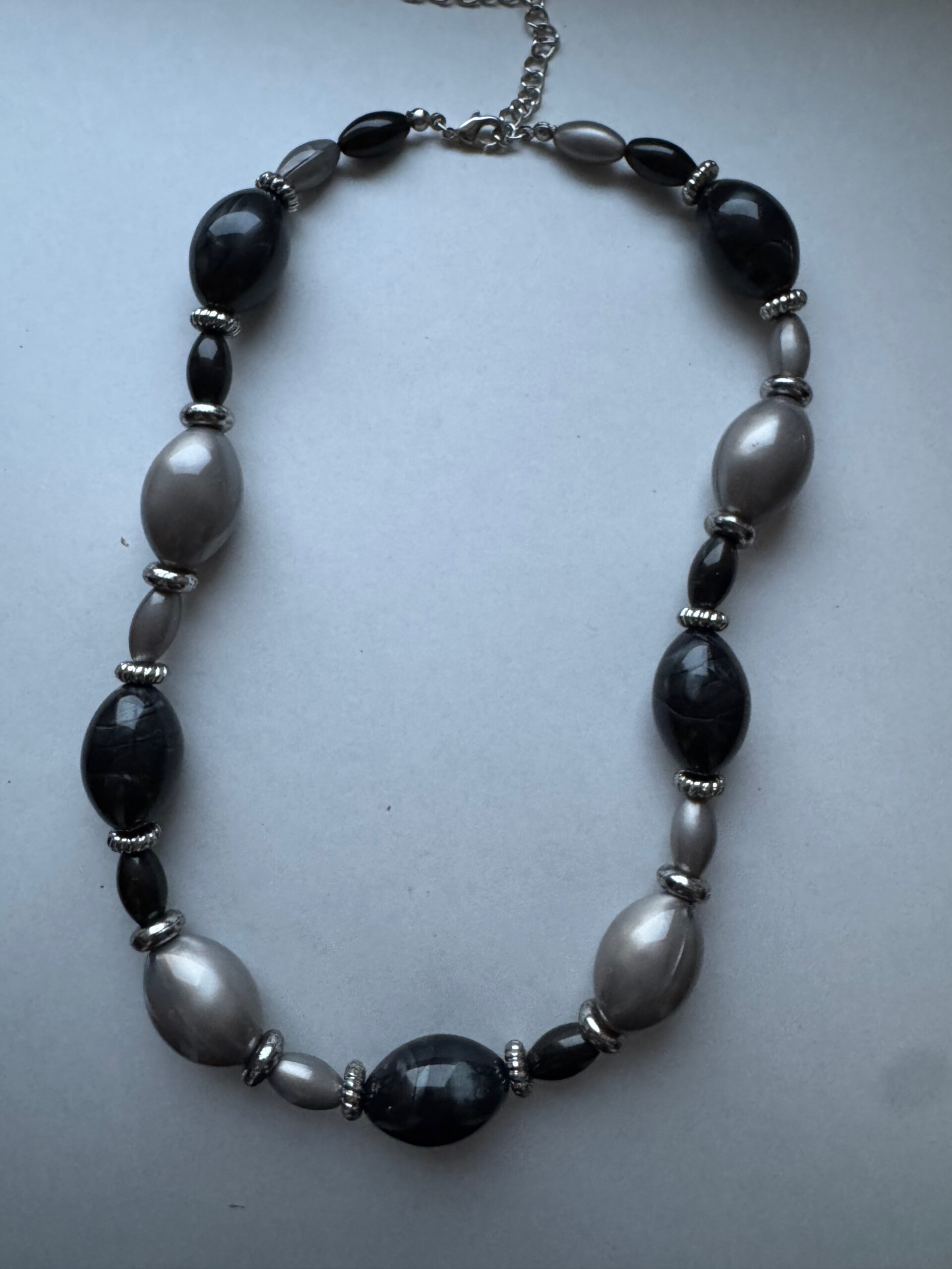 Een hele mooie handgemaakte ketting. Het is een mooie zwart grijze ketting met wat grotere kralen in grijs, zwart en antraciet. Het is echt een hele mooie ketting met verlengketting, zodat deze op verschillende standen gedragen kan worden. Het metaal is nikkelvrij. Pas echter wel op met parfum, dit kan uitbijten en kale plekken achterlaten.