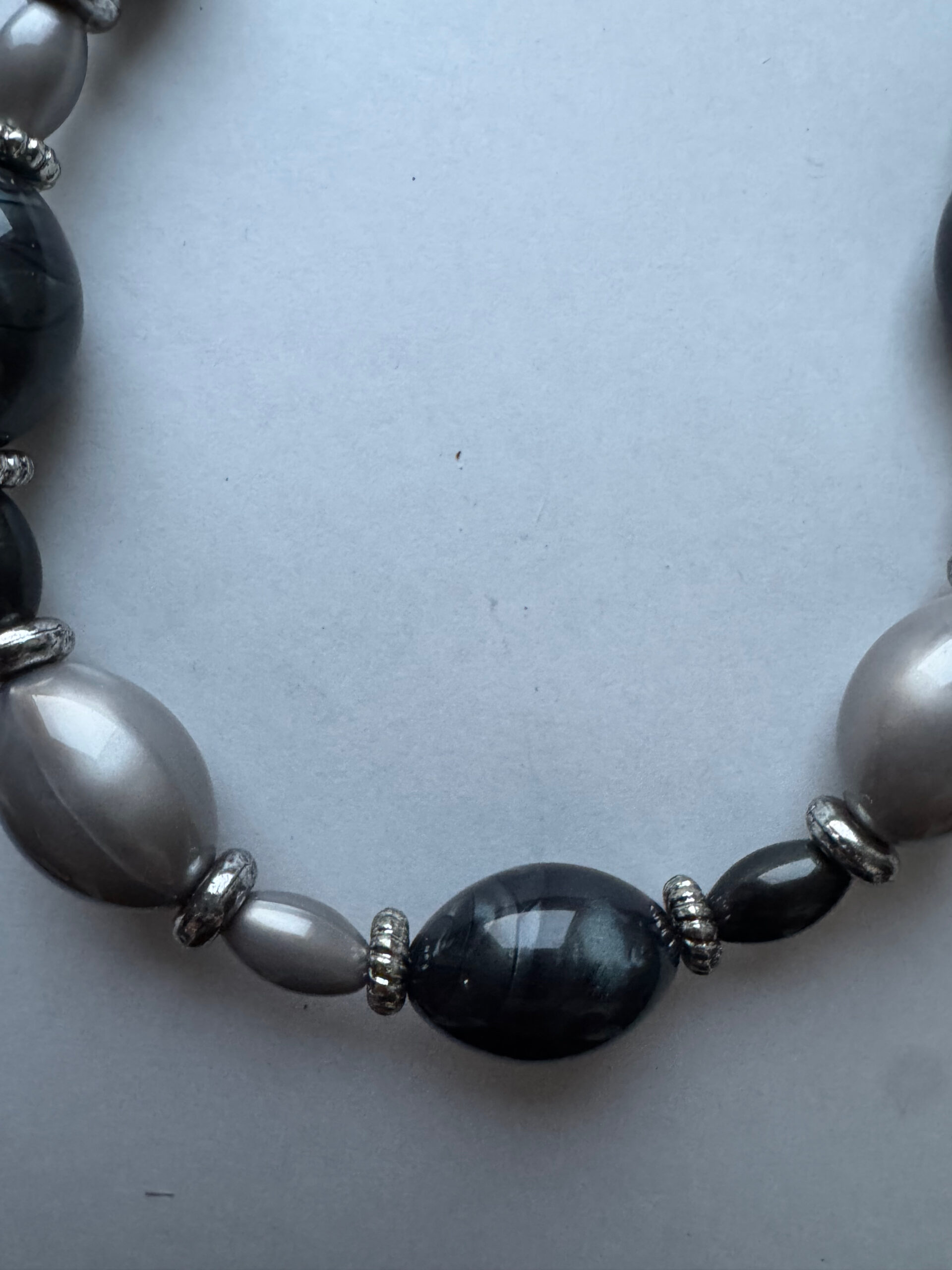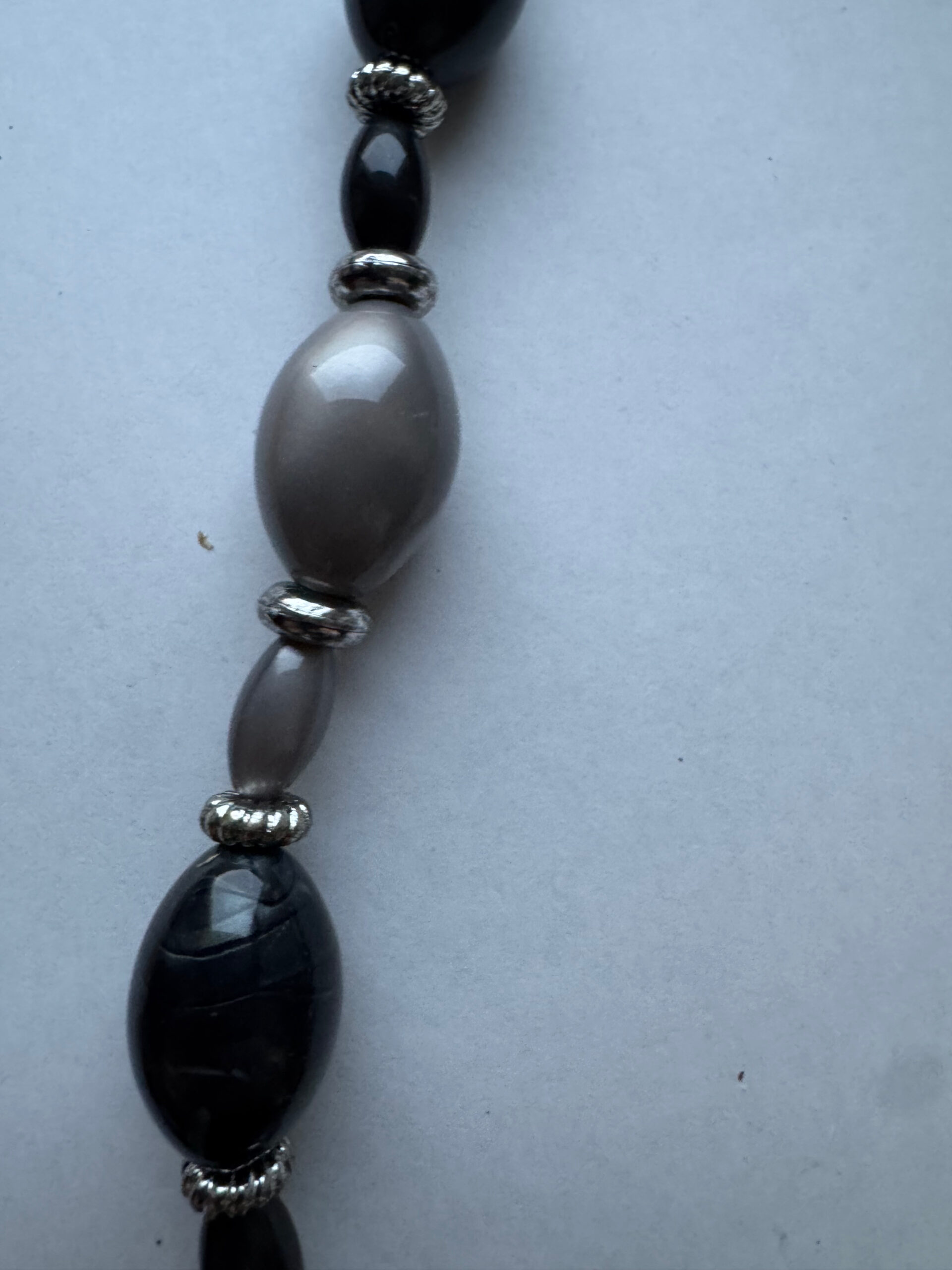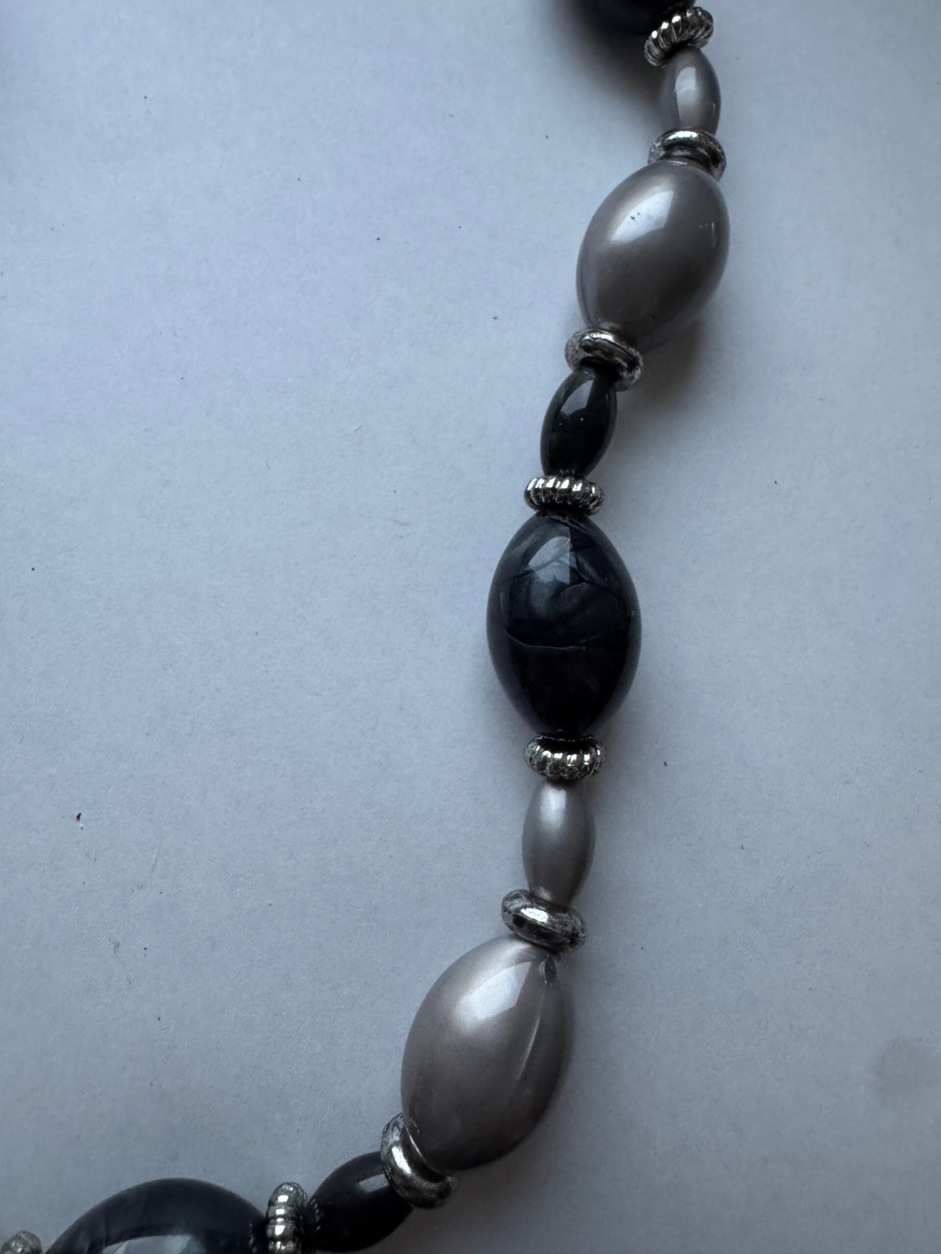 Een hele mooie handgemaakte ketting. Het is een mooie zwart grijze ketting met wat grotere kralen in grijs, zwart en antraciet. Het is echt een hele mooie ketting met verlengketting, zodat deze op verschillende standen gedragen kan worden. Het metaal is nikkelvrij. Pas echter wel op met parfum, dit kan uitbijten en kale plekken achterlaten.