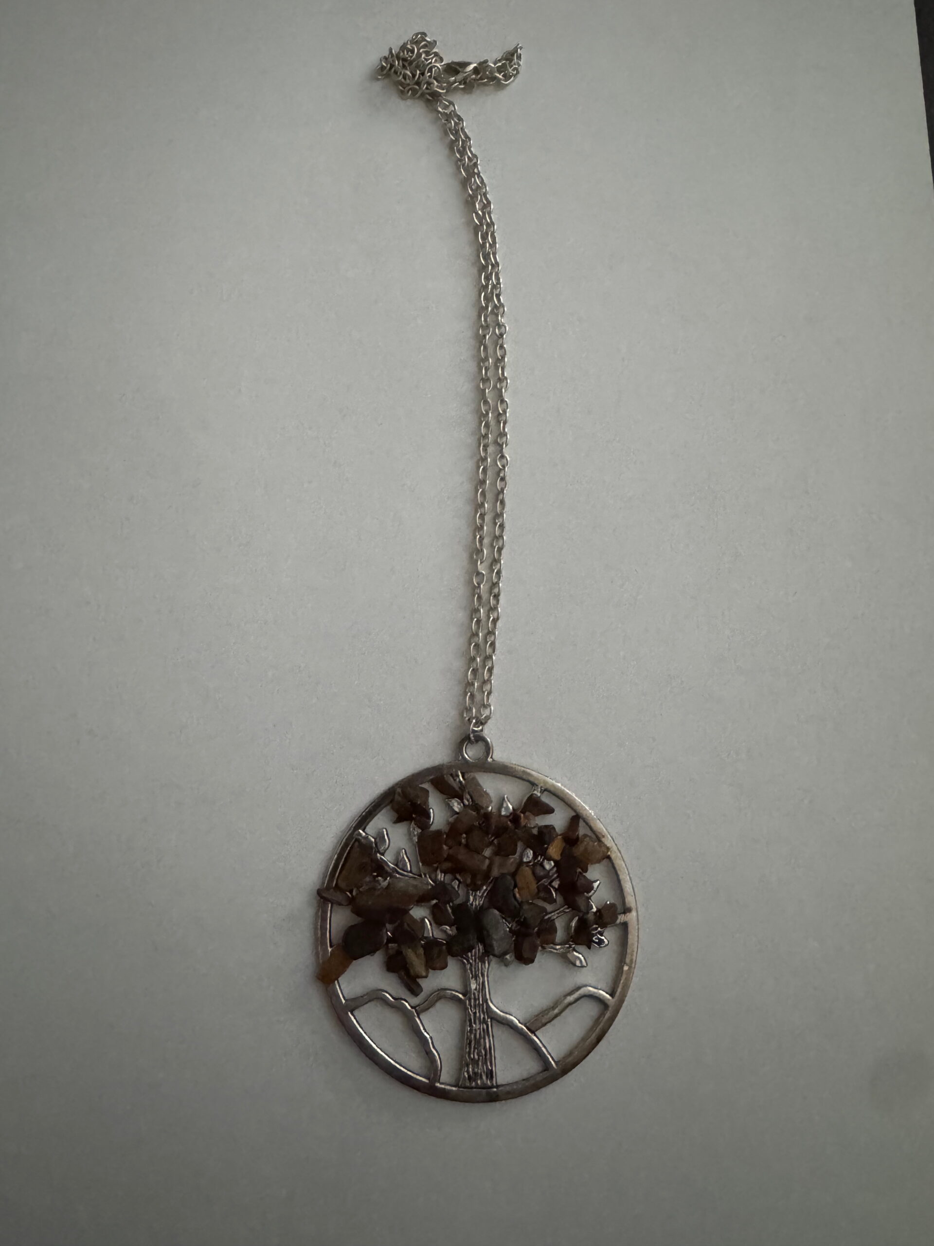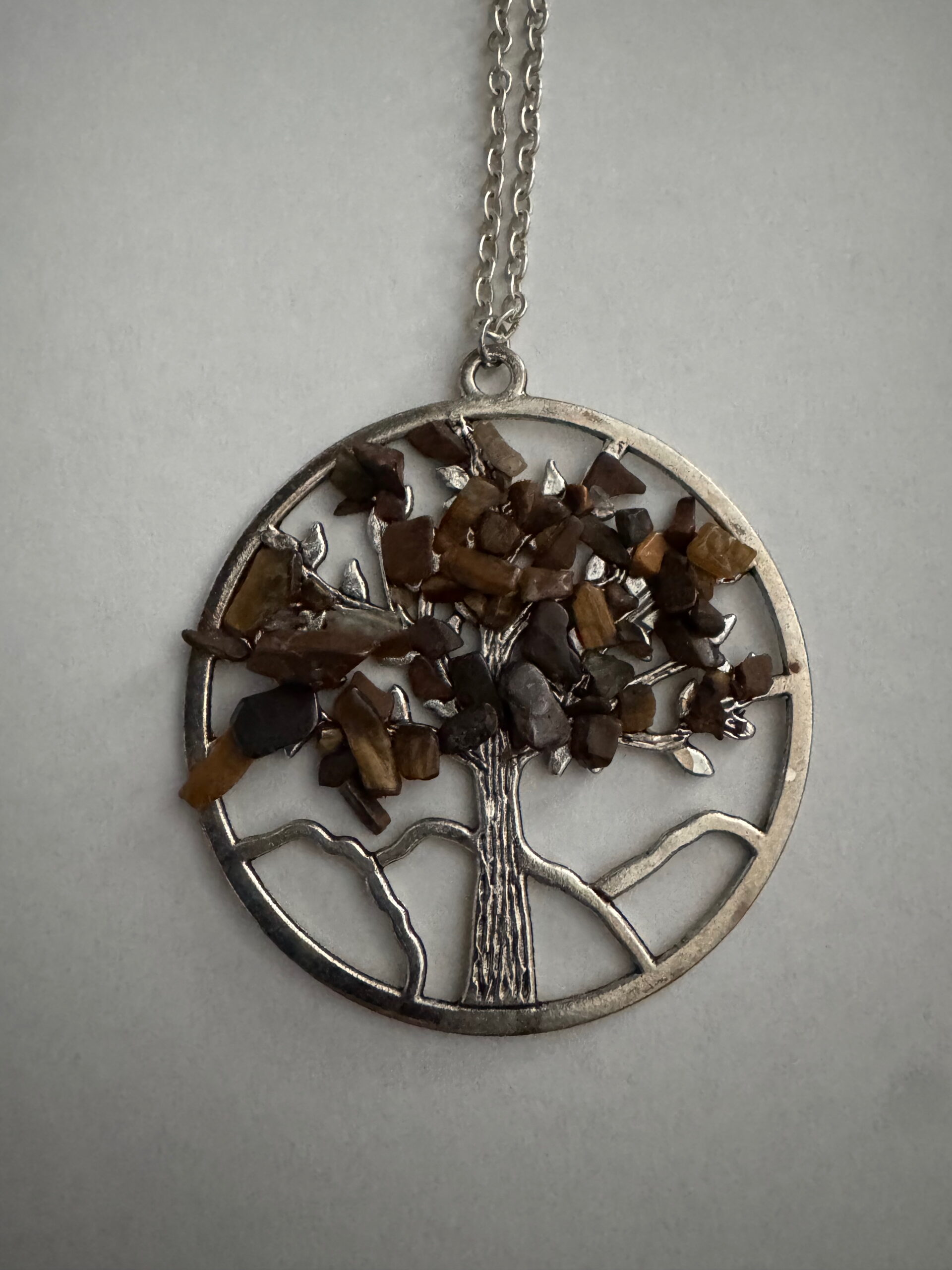 Een mooie zelfgemaakte lange ketting met een hanger tree of life met natuursteen. De ketting is een schakelketting van ca 48 cm lang. De hanger is ca 6,5 cm groot.