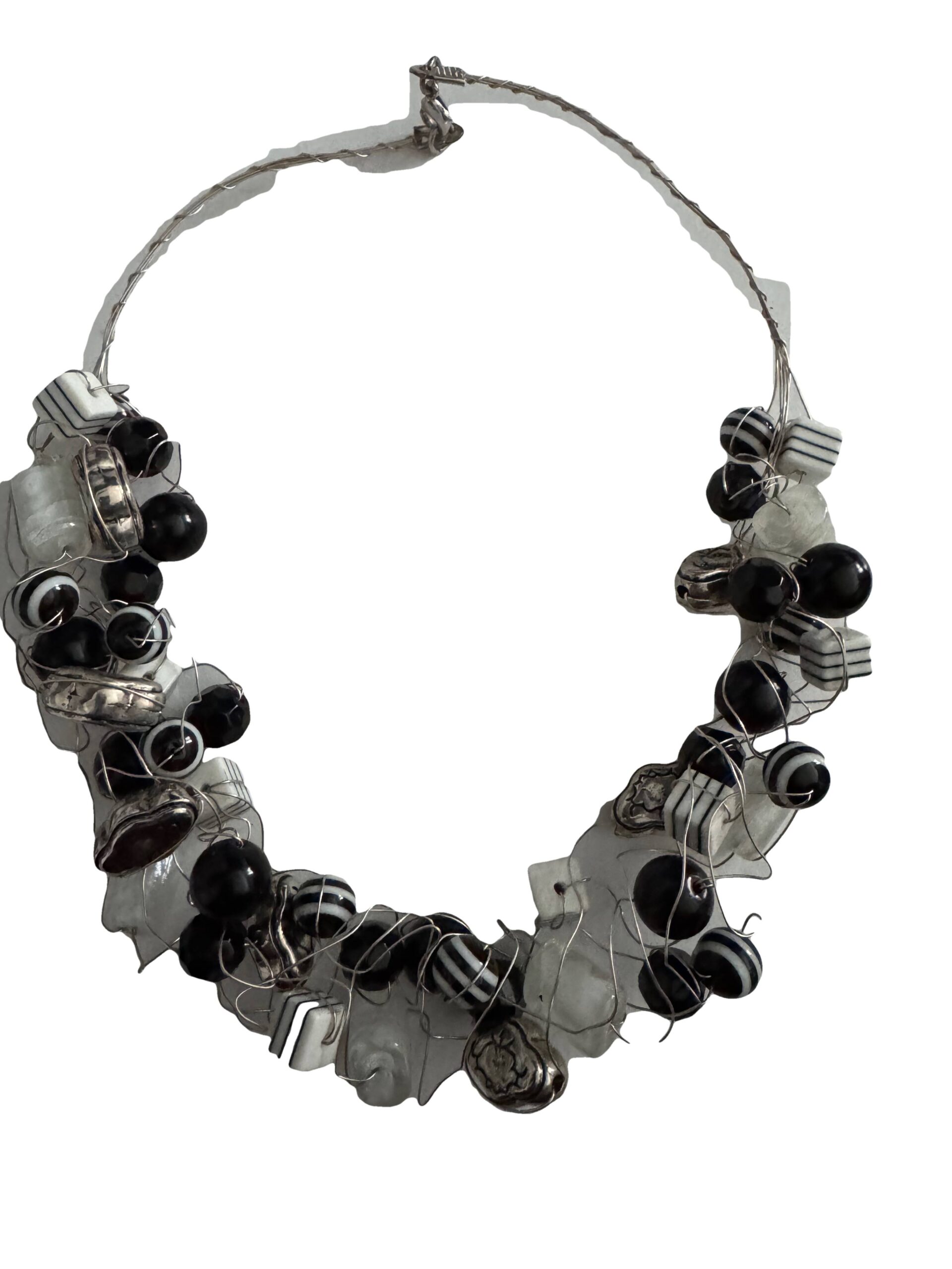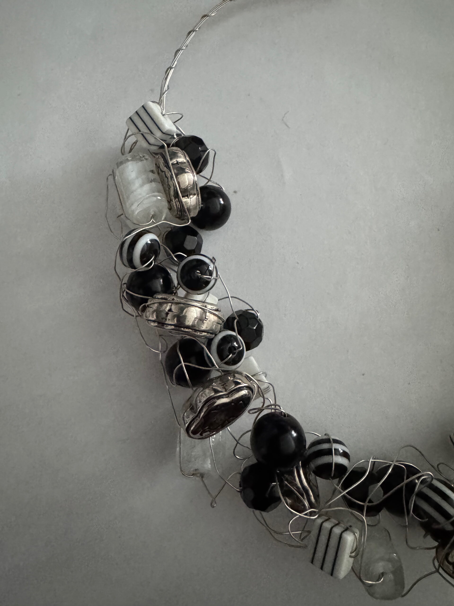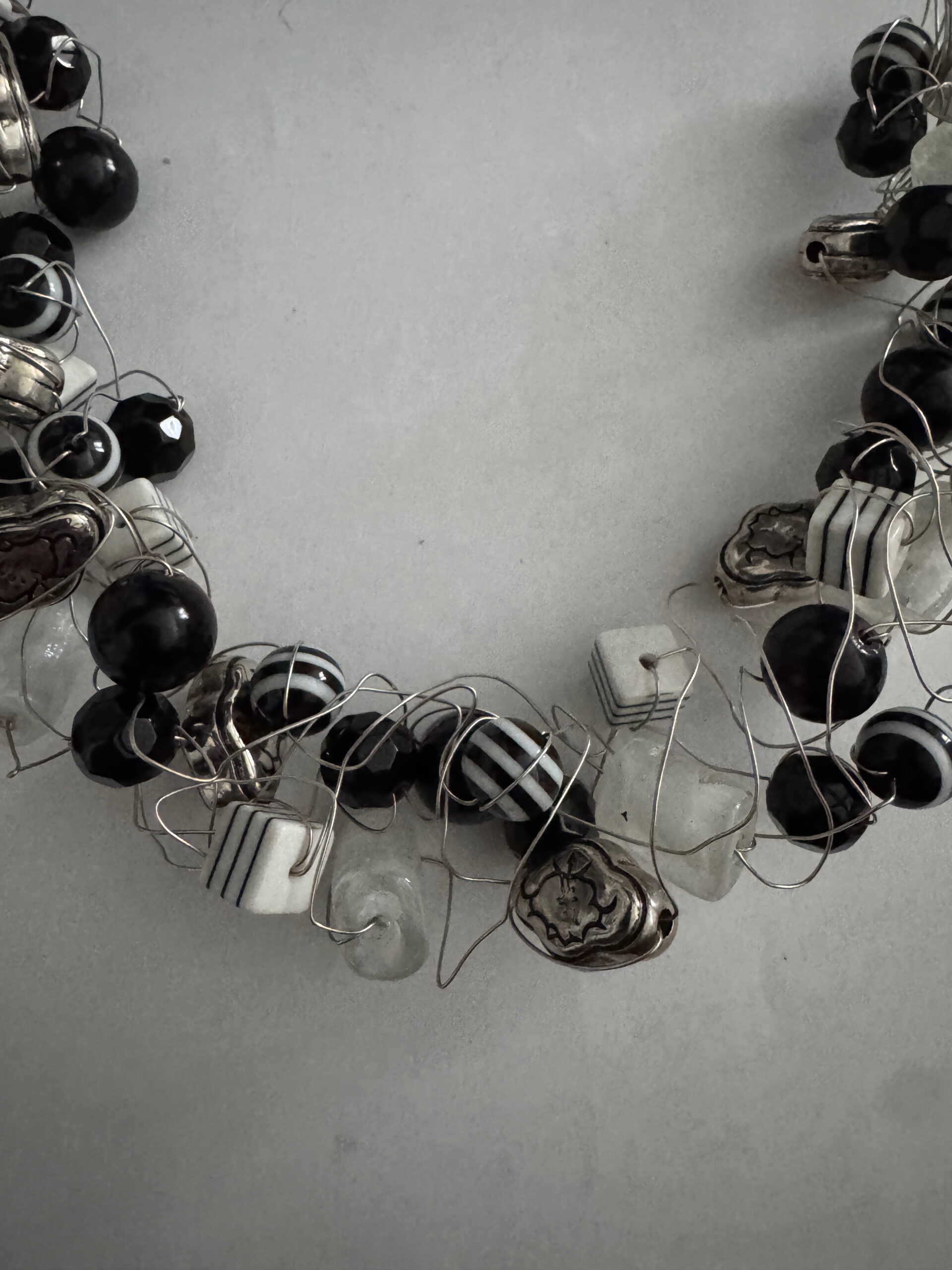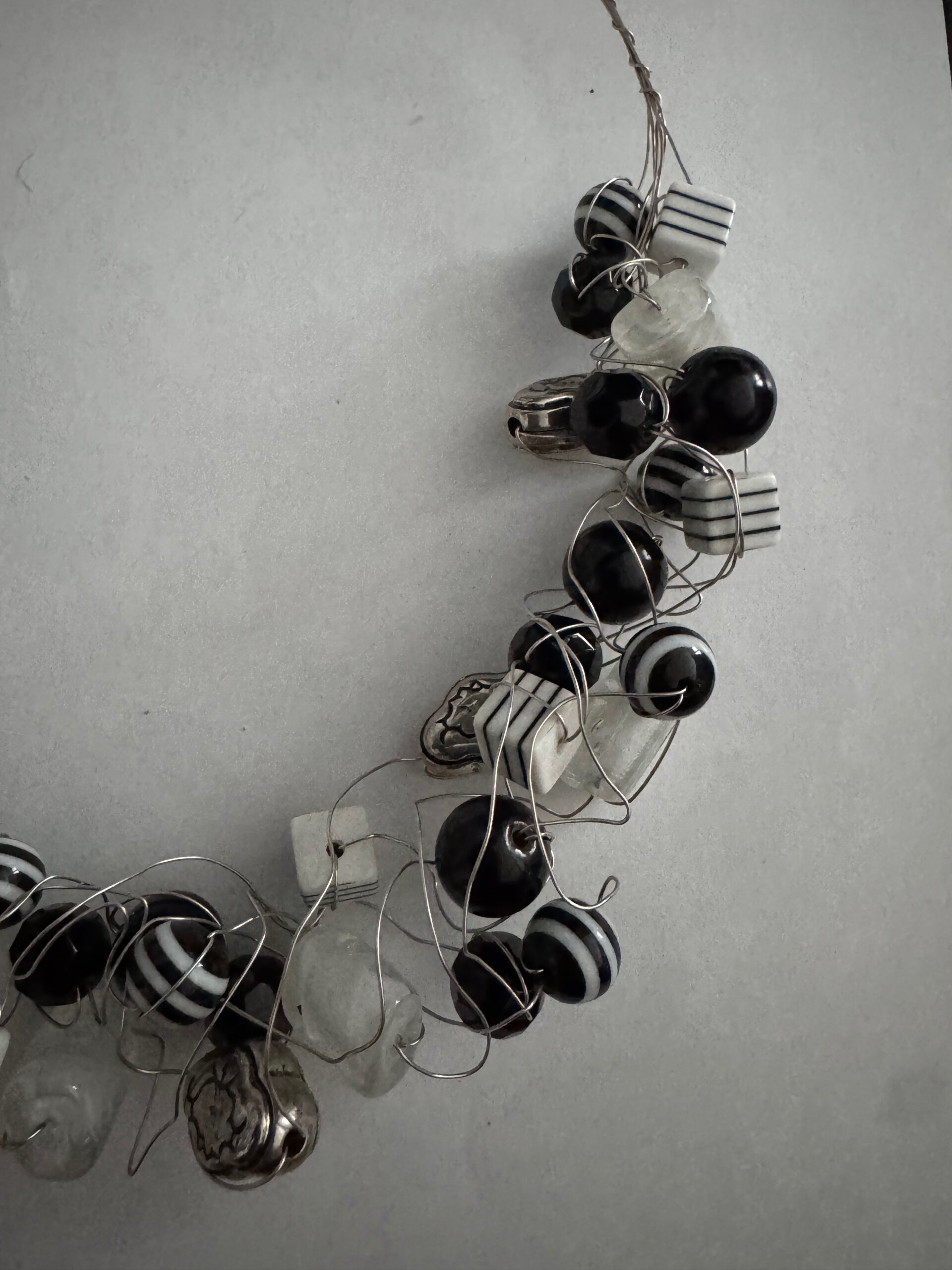 Een mooie zelfgemaakte kreukelketting op verzilverd metaaldraad. De kleuren zijn verschillende soorten zwart wit kralen. De ketting is 47 cm zonder verlengketting. Op verzoek kan ik er een verlengketting aanmaken. Dit dan graag aangeven bij uw bestelling.
