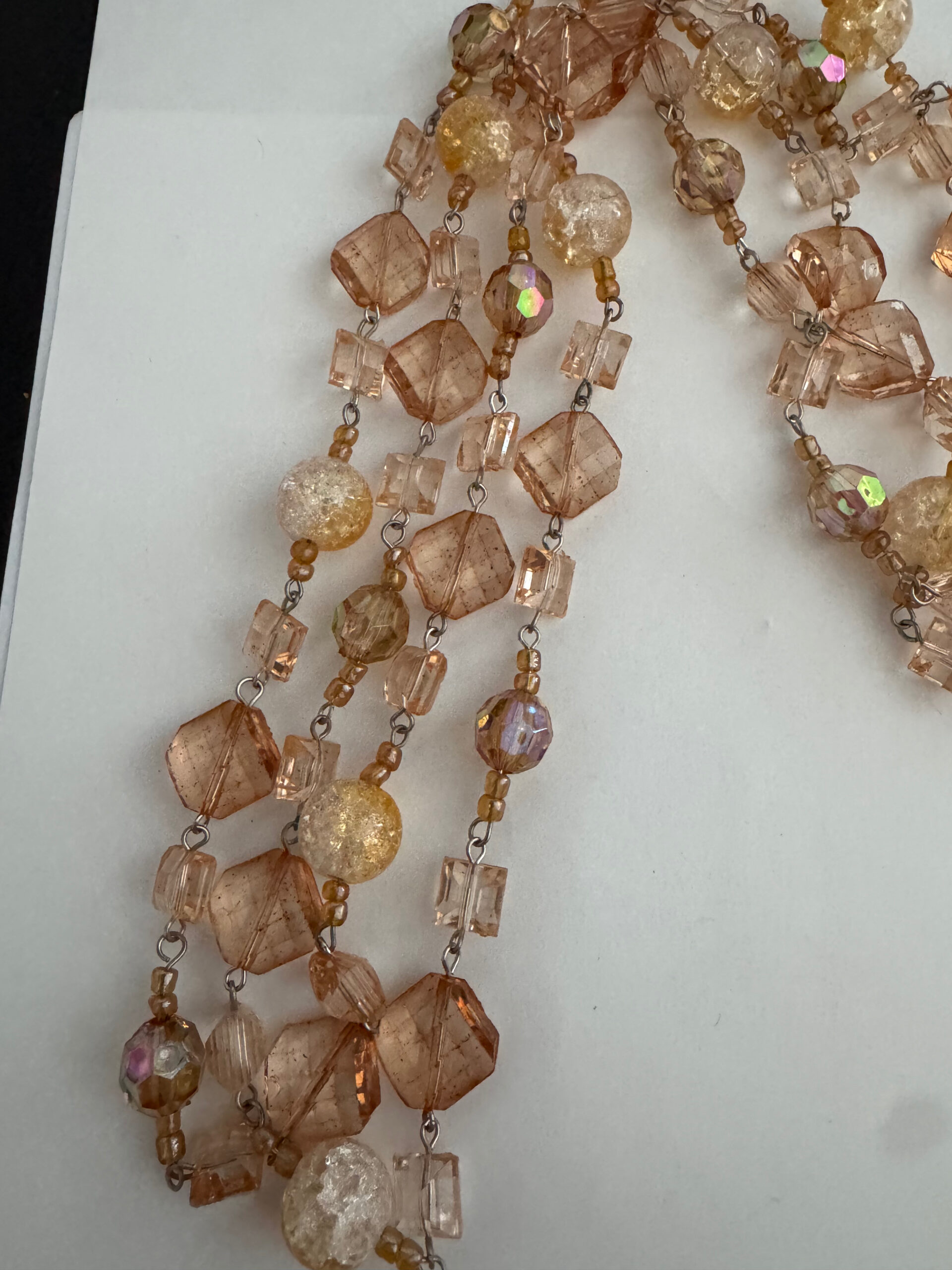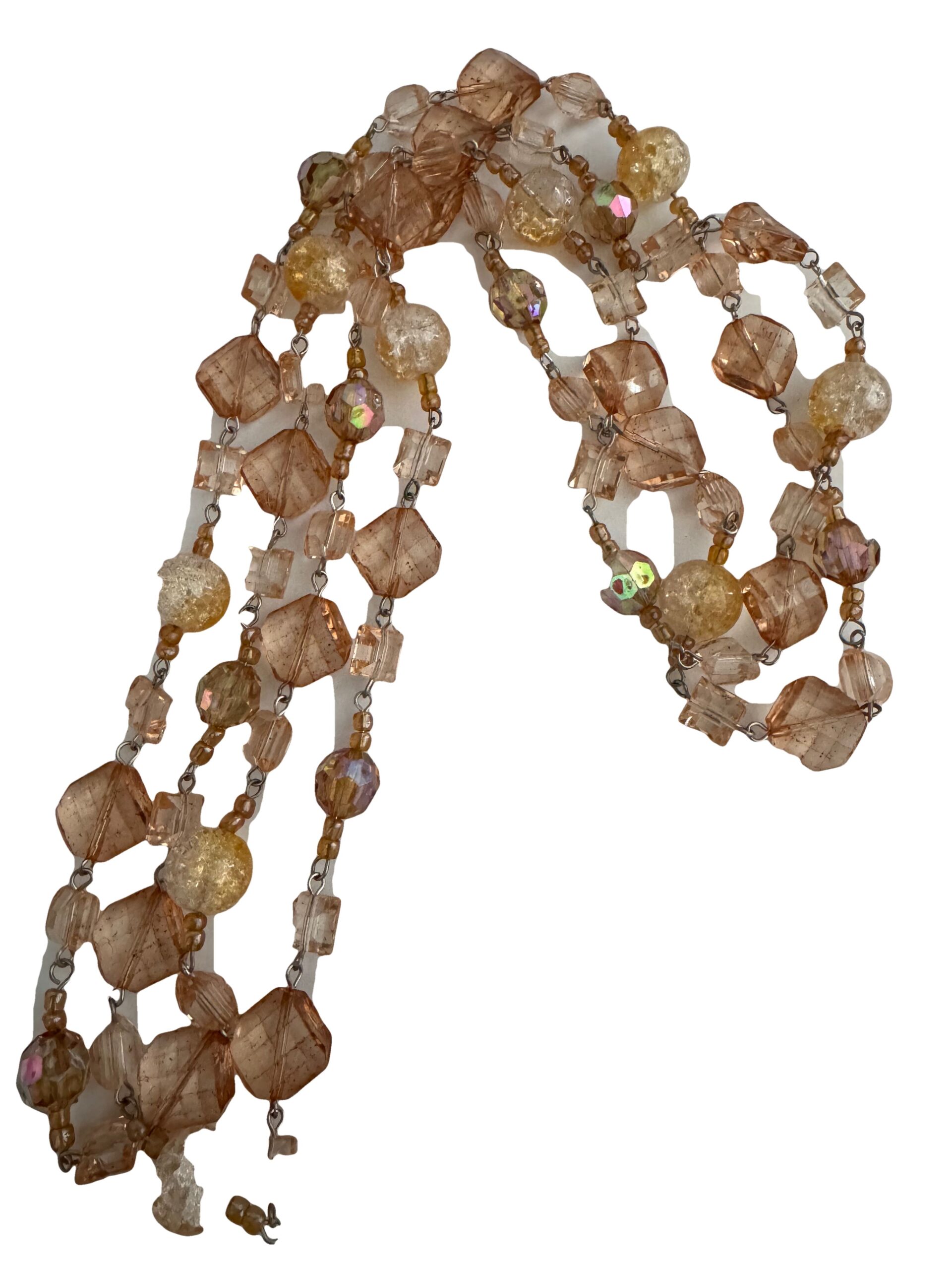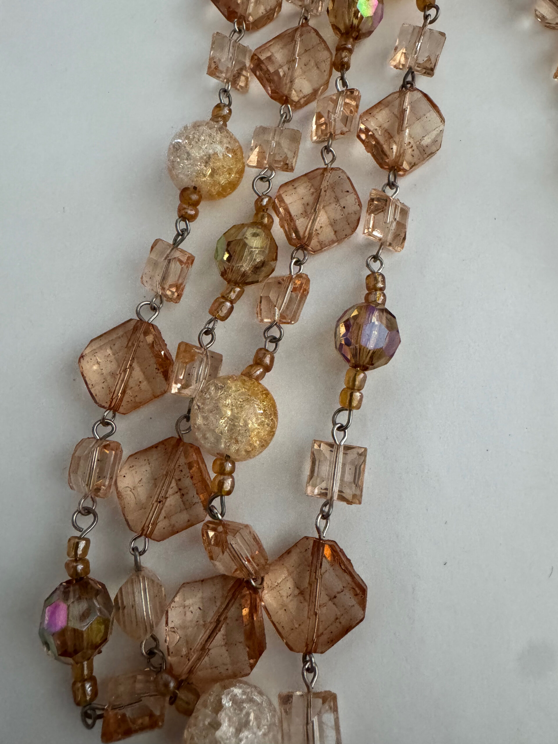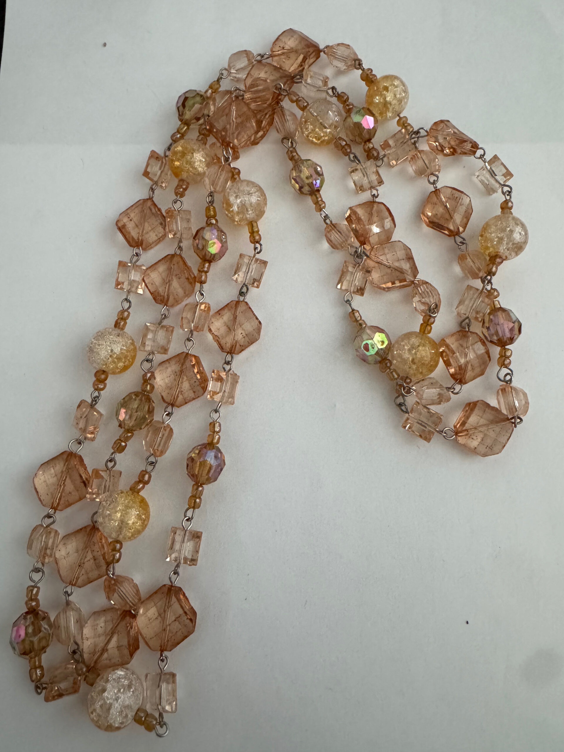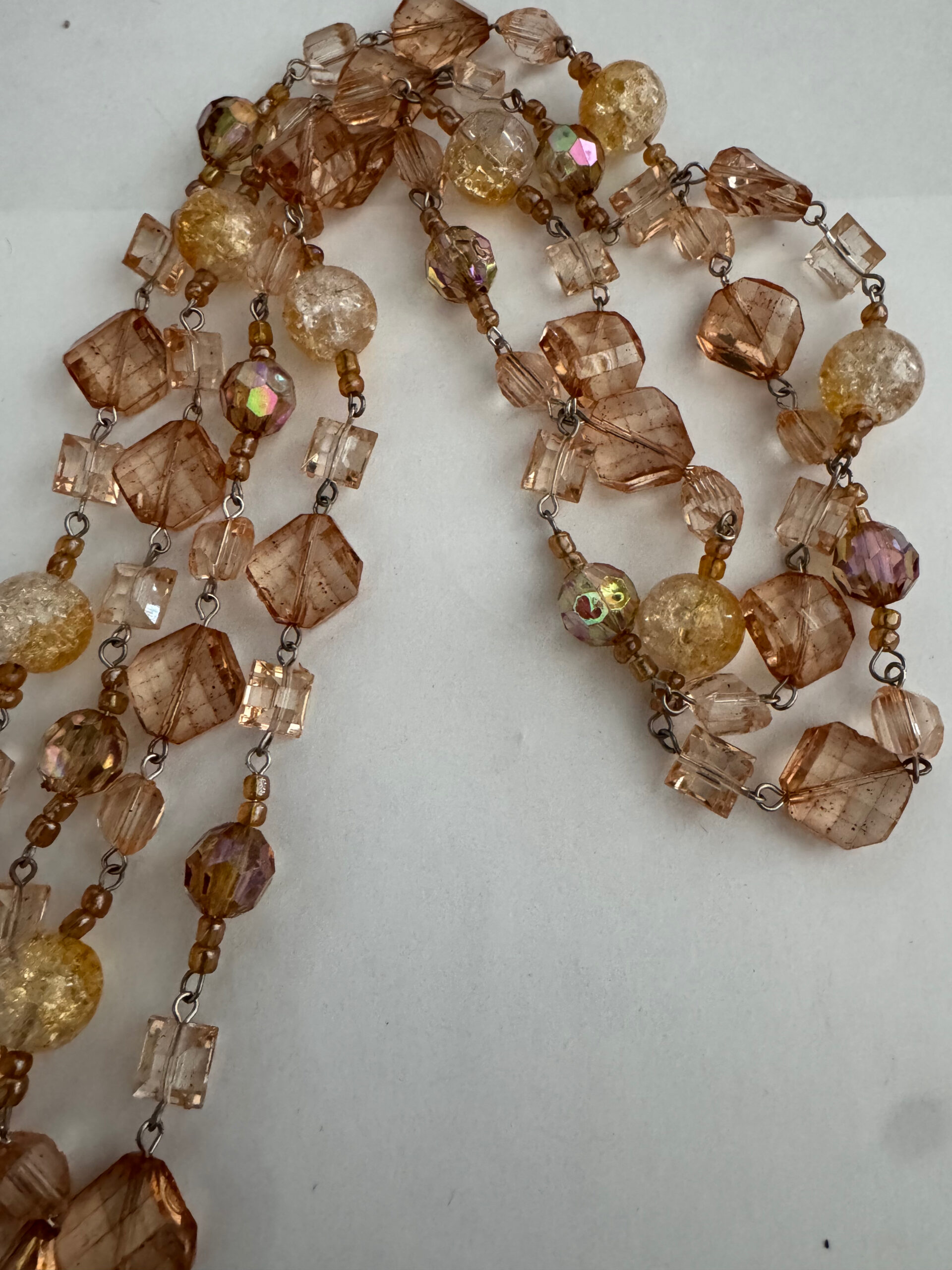 Een hele mooie handgemaakte lange ketting bestaande gekettelde kralen in donkerchampagne kleur met verschillende maten en soorten facetkralen.