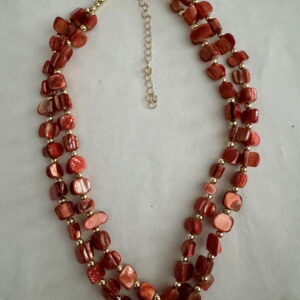 Een mooie zelfgemaakte ketting met rode schelpkralen en goudkleurige kraaltjes. De ketting heeft 2 laagjes. De ketting is afgewerkt met een goudkleurige sluiting. De ketting is 44 cm. De ketting heeft een verlengketting en kan tot 53 cm gedragen worden. Zo kunt u zelf een ideale lengte bepalen. Dit model hebben we in meerdere kleuren.