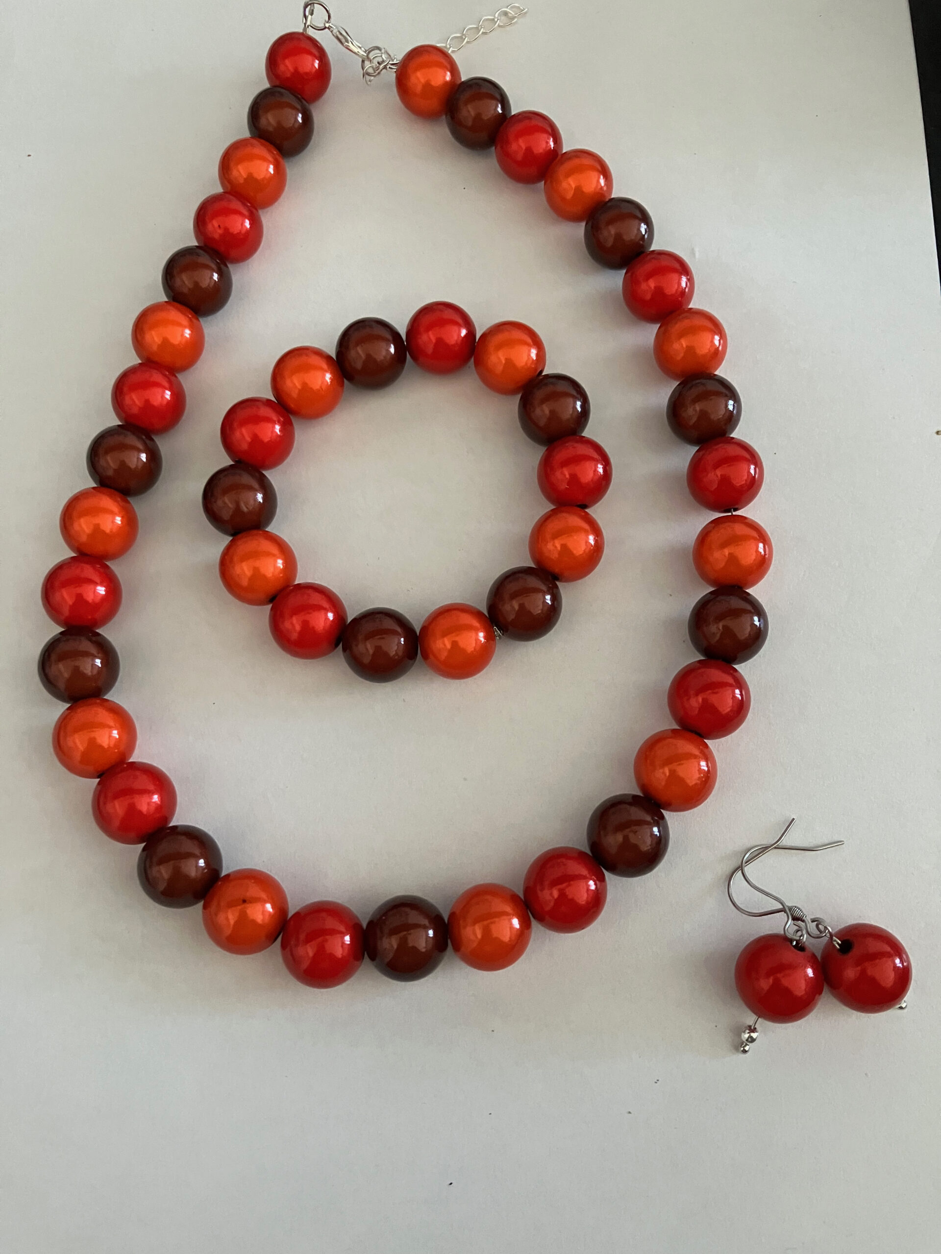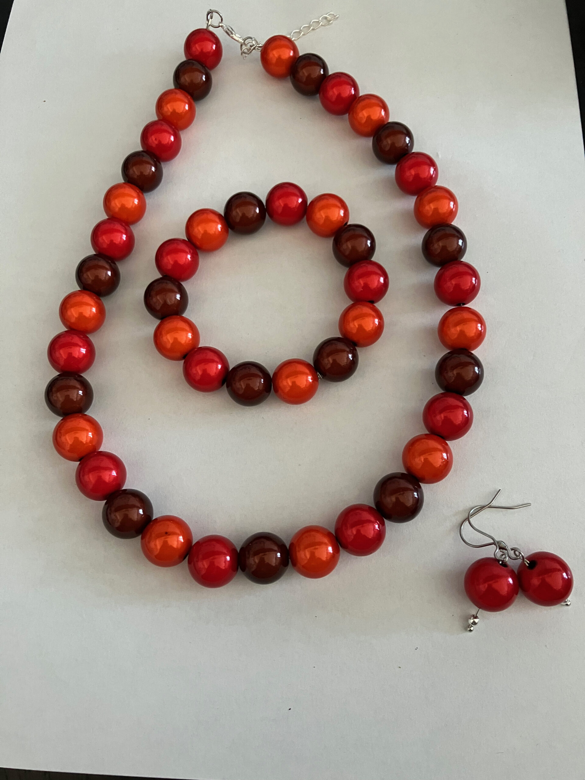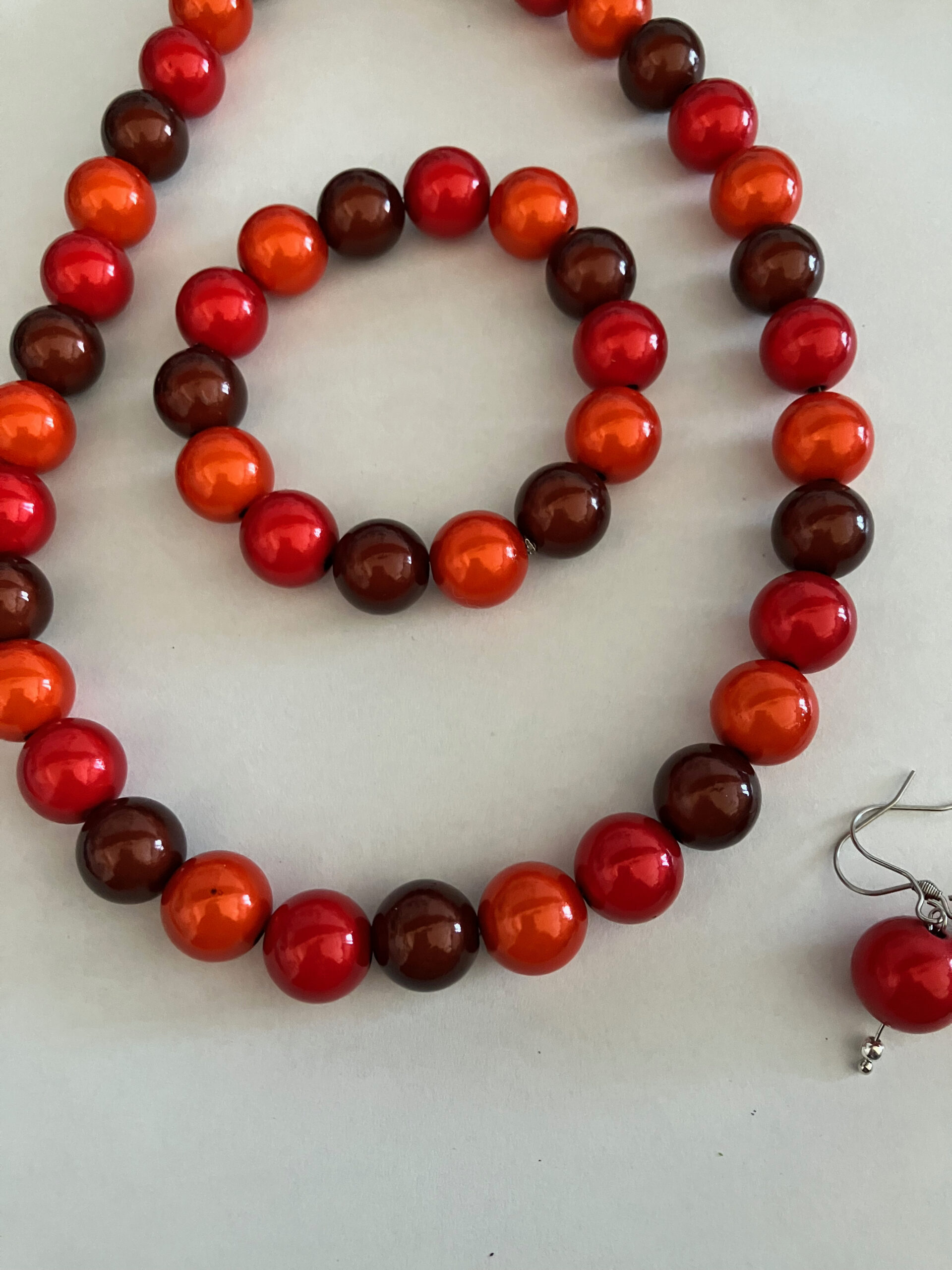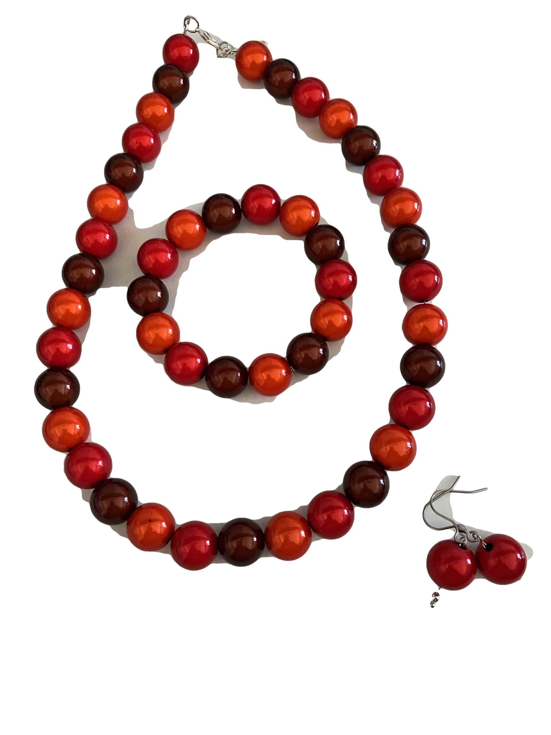 Een hele mooie zelfgemaakte sieradenset. Deze set bestaat uit een ketting met 3D kralen (rood, oranje en bruin), een bijpassende armband en hangende oorbellen. U zult deze set nergens anders zien, behalve op mijn eigen website.