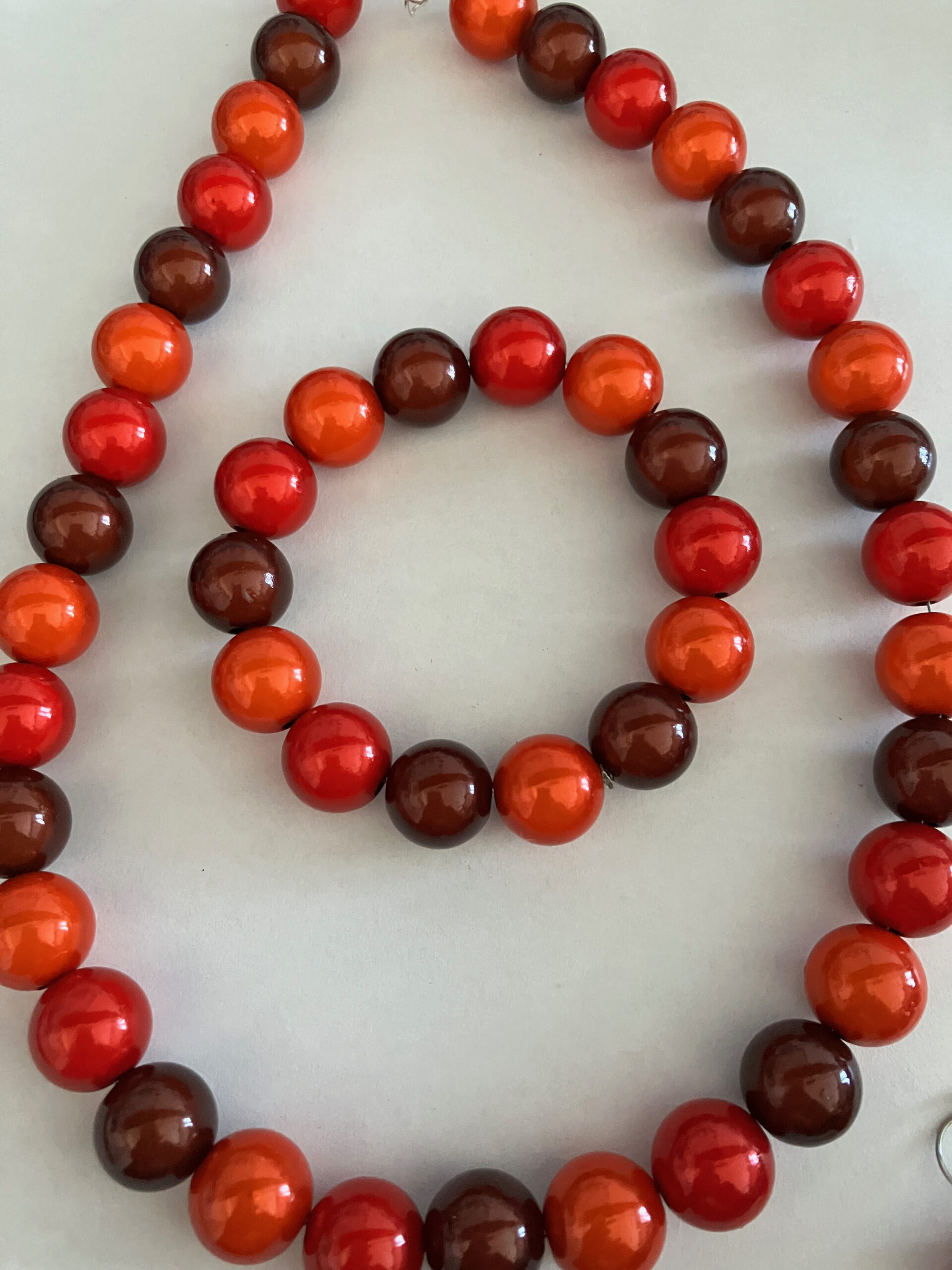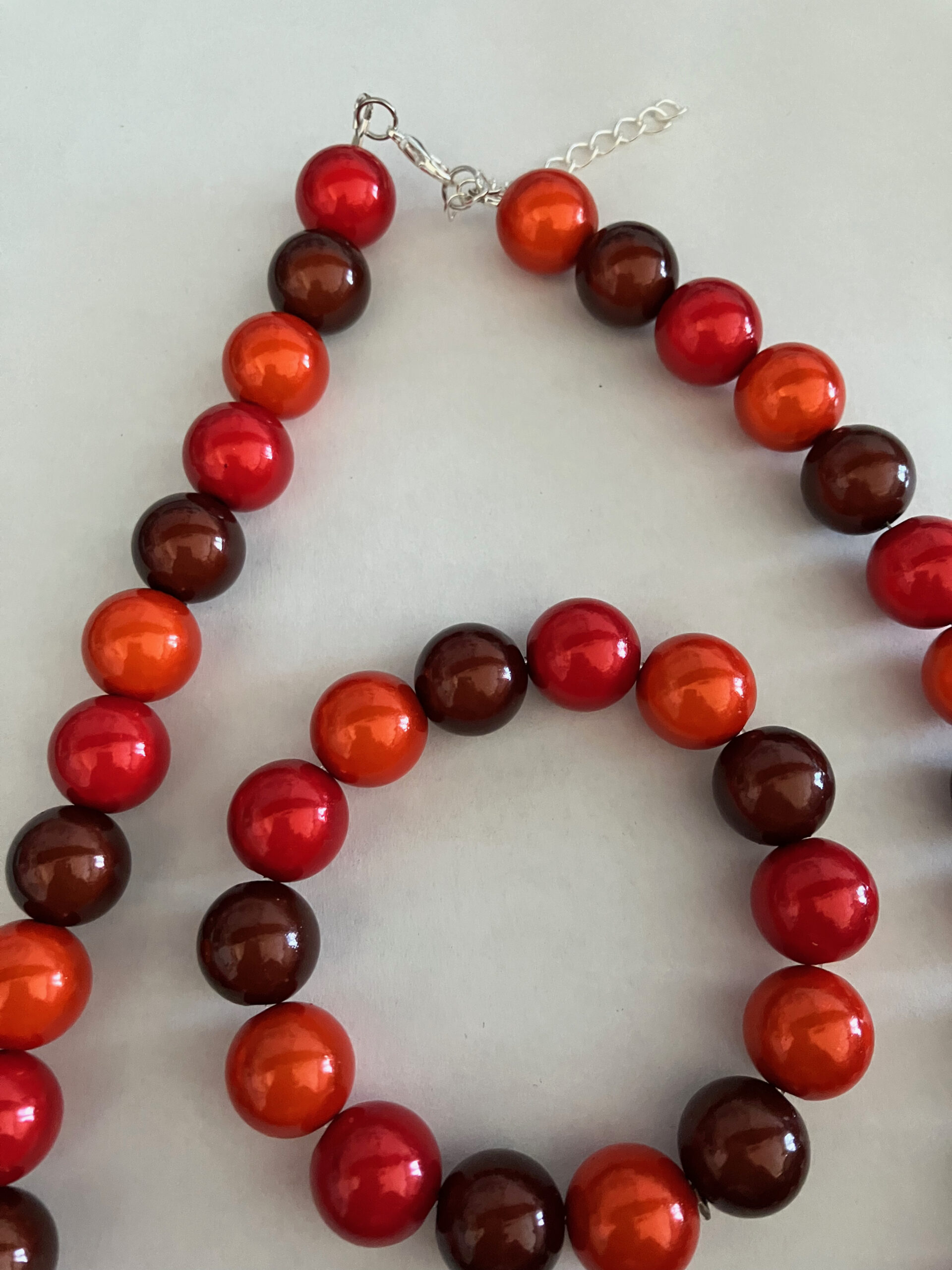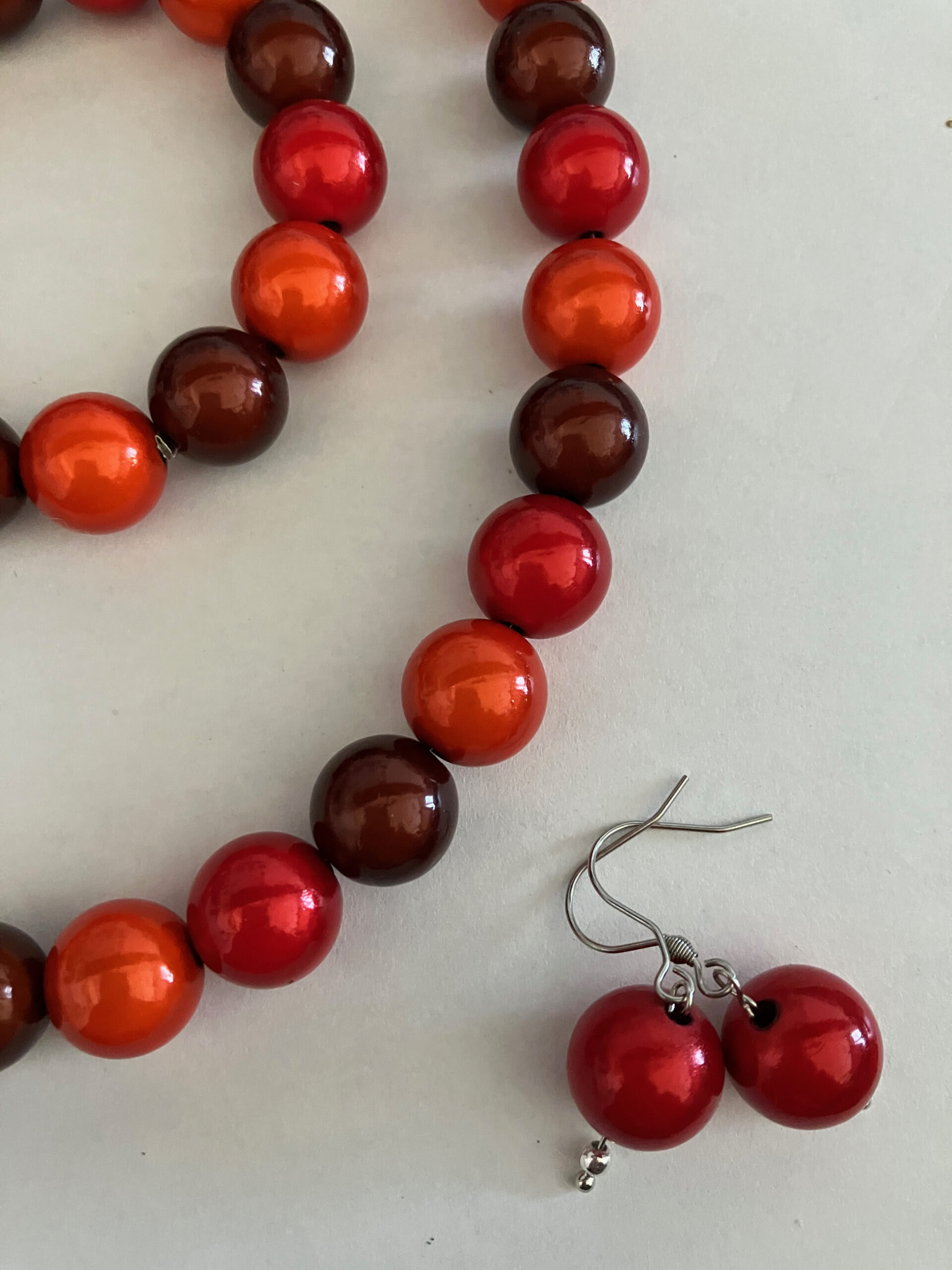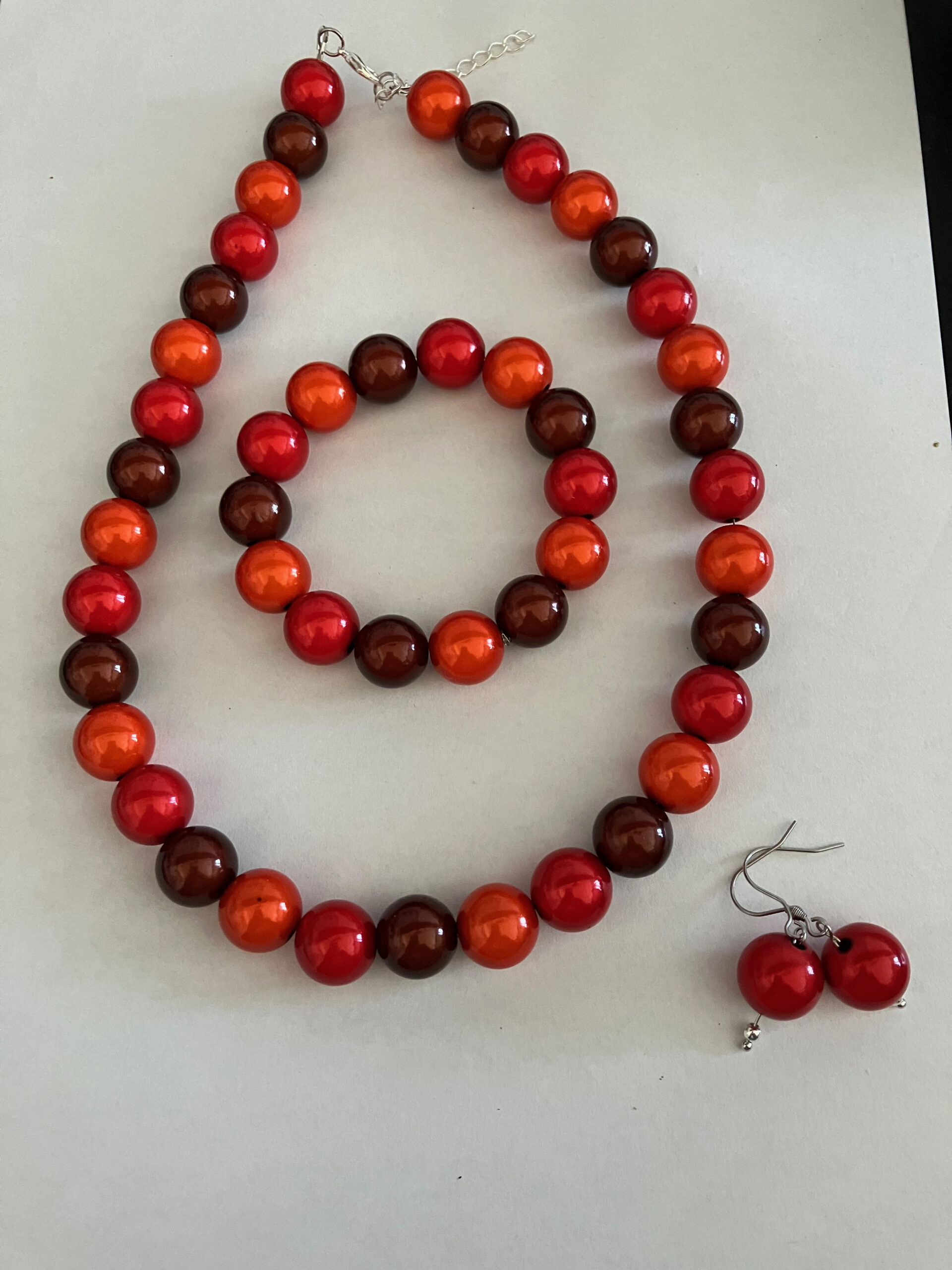 Een hele mooie zelfgemaakte sieradenset. Deze set bestaat uit een ketting met 3D kralen (rood, oranje en bruin), een bijpassende armband en hangende oorbellen. U zult deze set nergens anders zien, behalve op mijn eigen website.