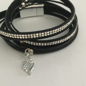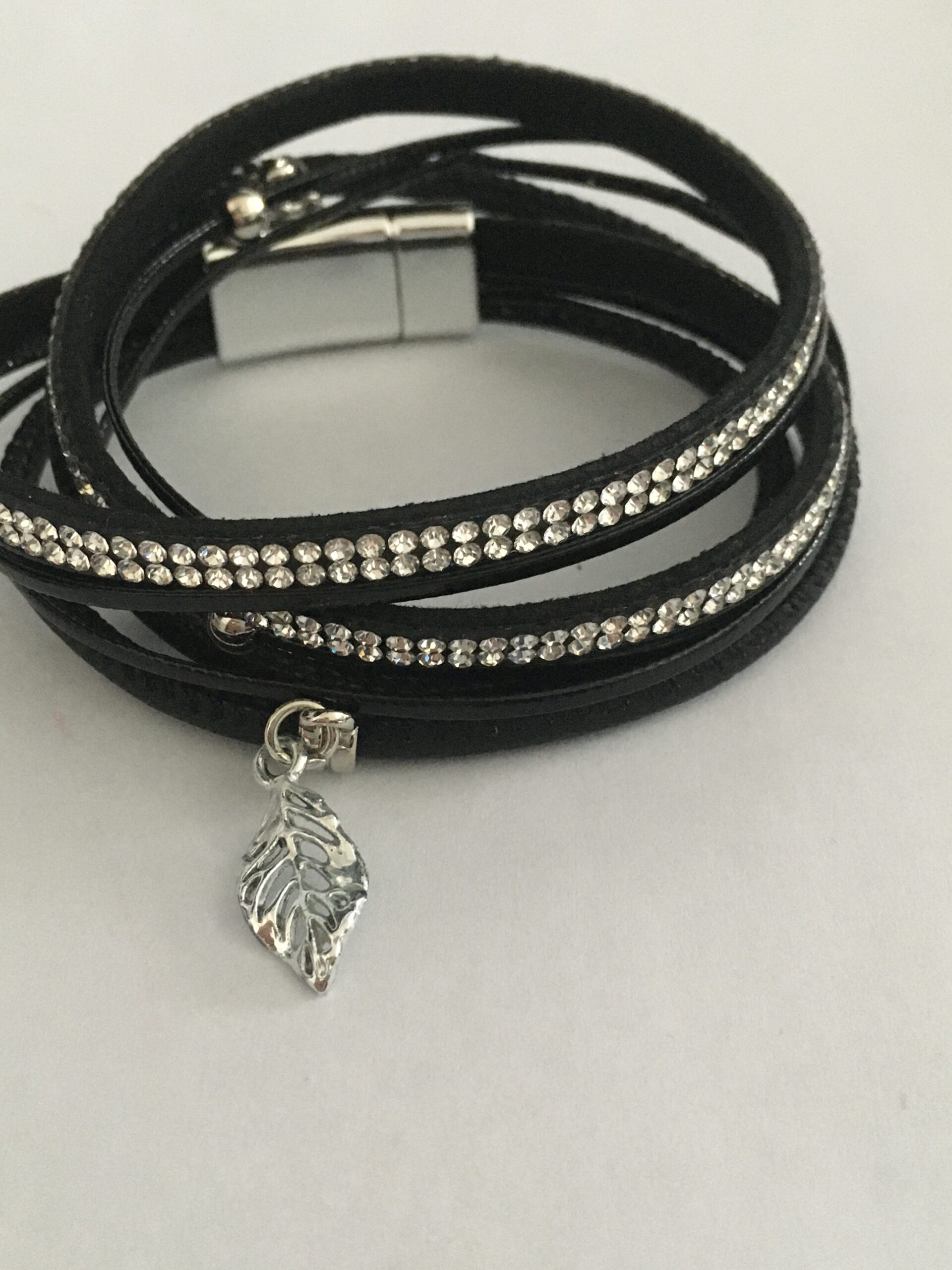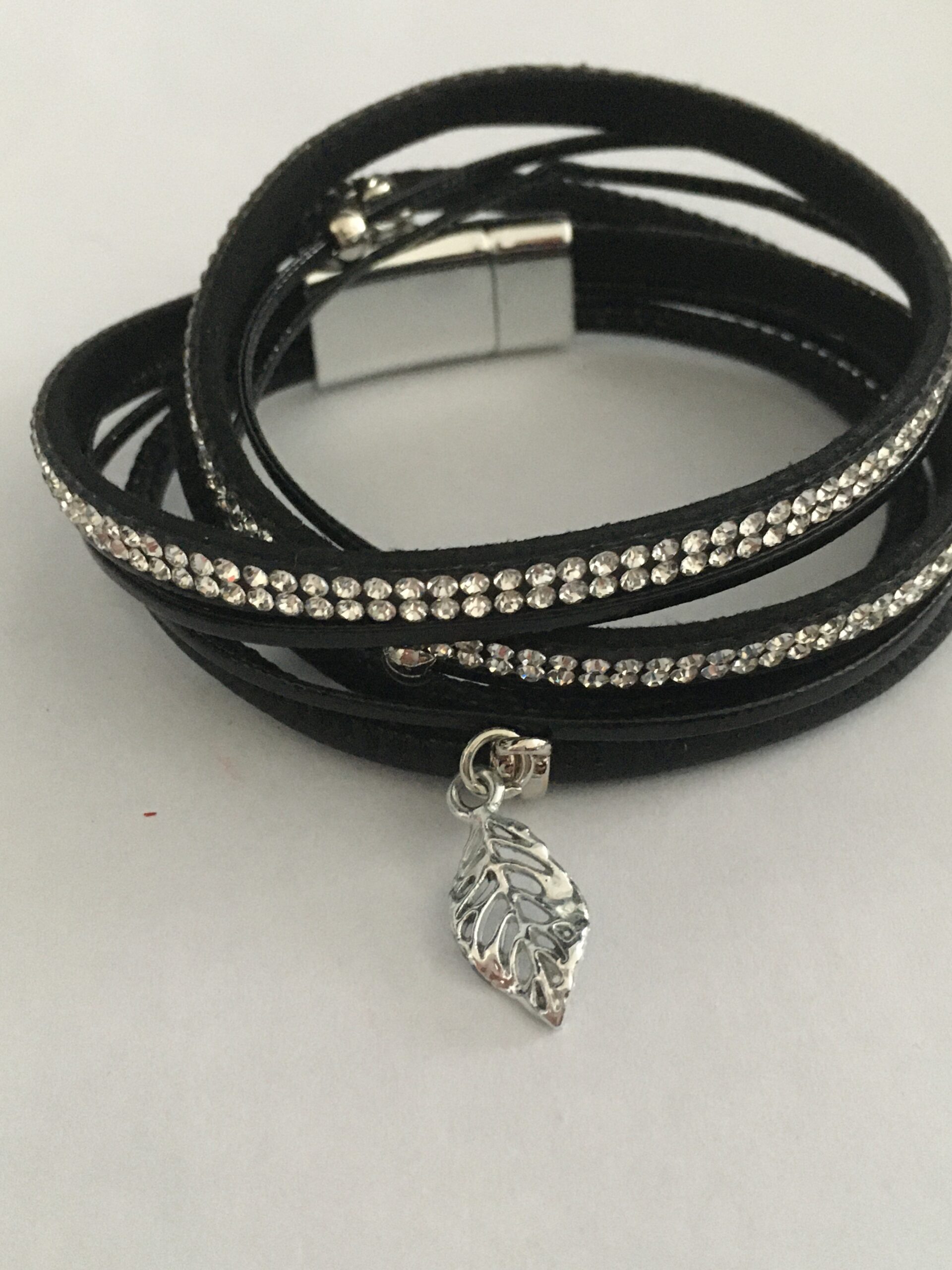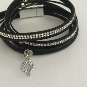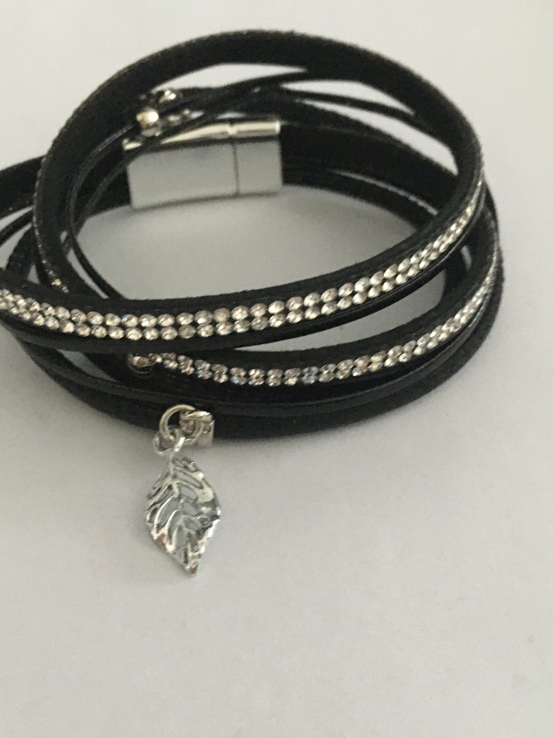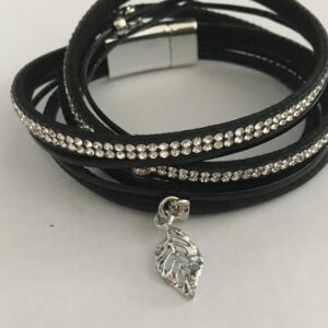 Een mooie leren wikkelarmband met een mooie magneetsluiting. De armband heeft verschillende strengen leer. De armband wikkelt twee keer om uw pols. De maat is ongeveer 39 cm. Meet uw pols alstublieft goed op, dit om teleurstellingen te voorkomen. De magneetsluiting is zilverkleurig en volledig nikkelvrij. Deze sluiting is erg makkelijk voor mensen met een fysieke beperking. Pas echter wel op met parfum, dit kan uitbijten en kale plekken achterlaten.