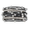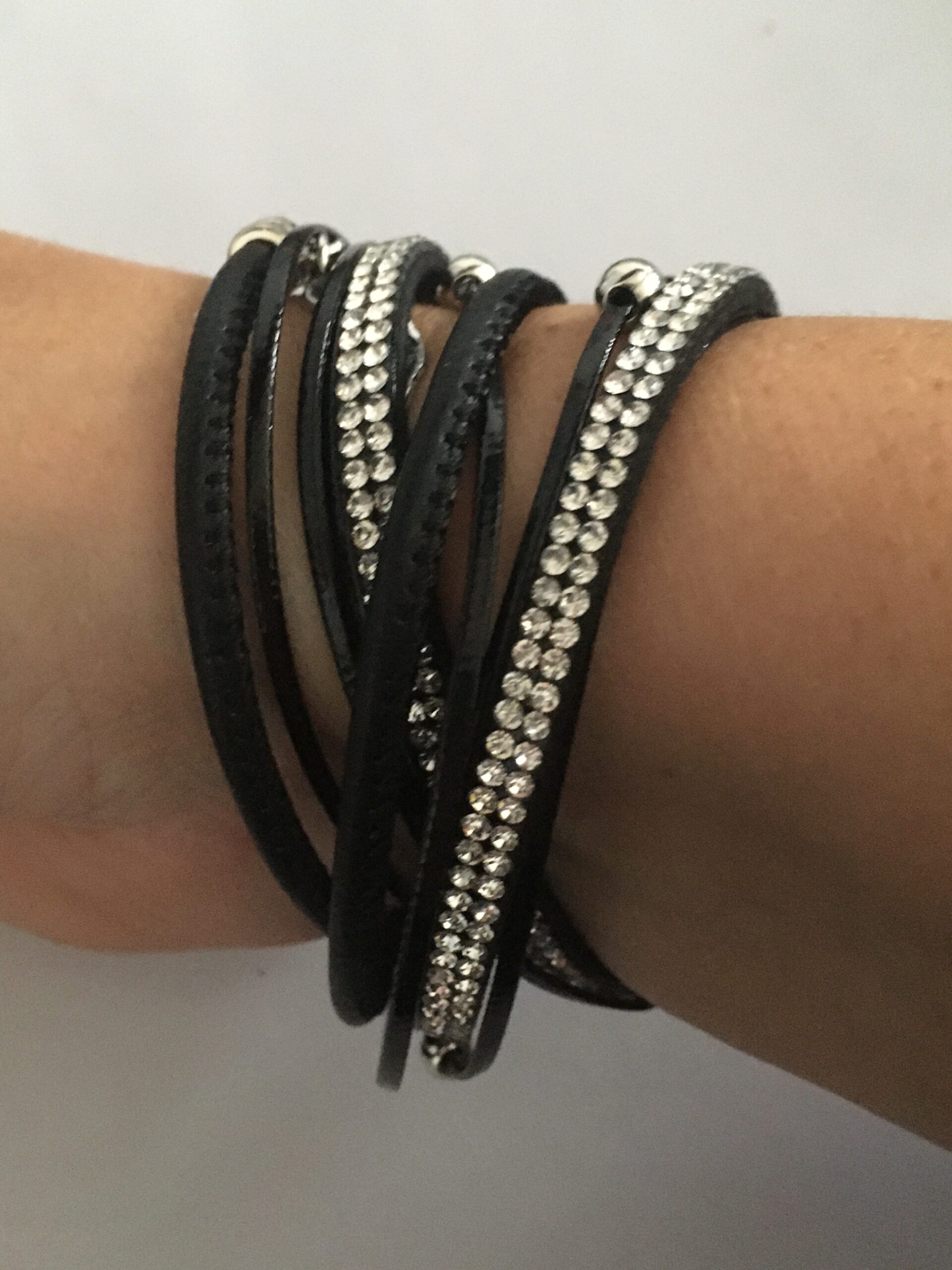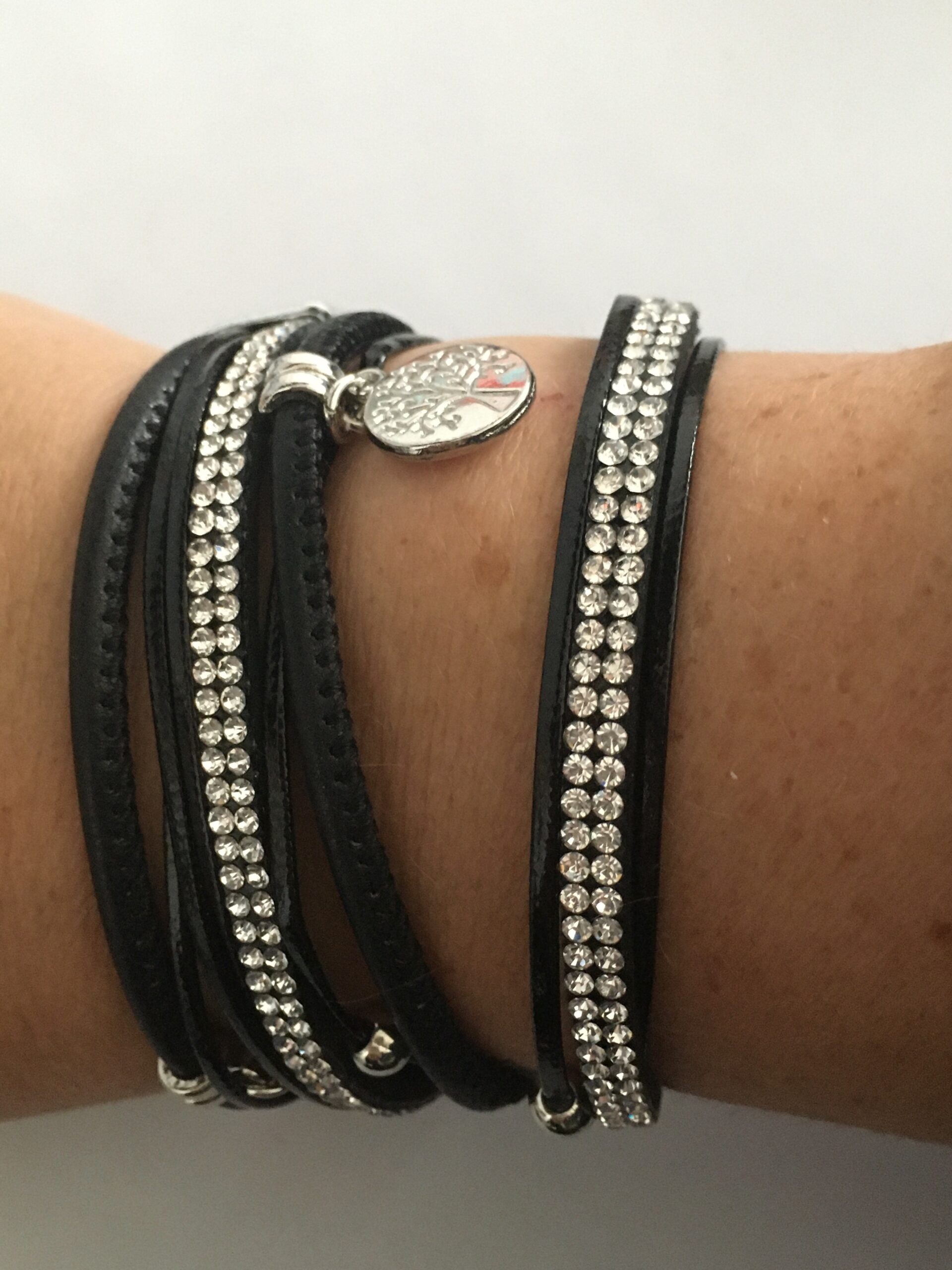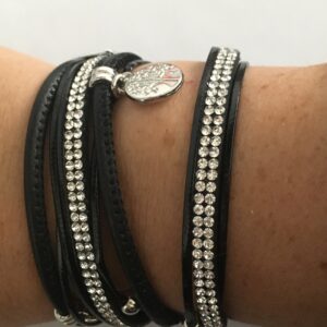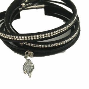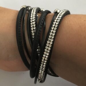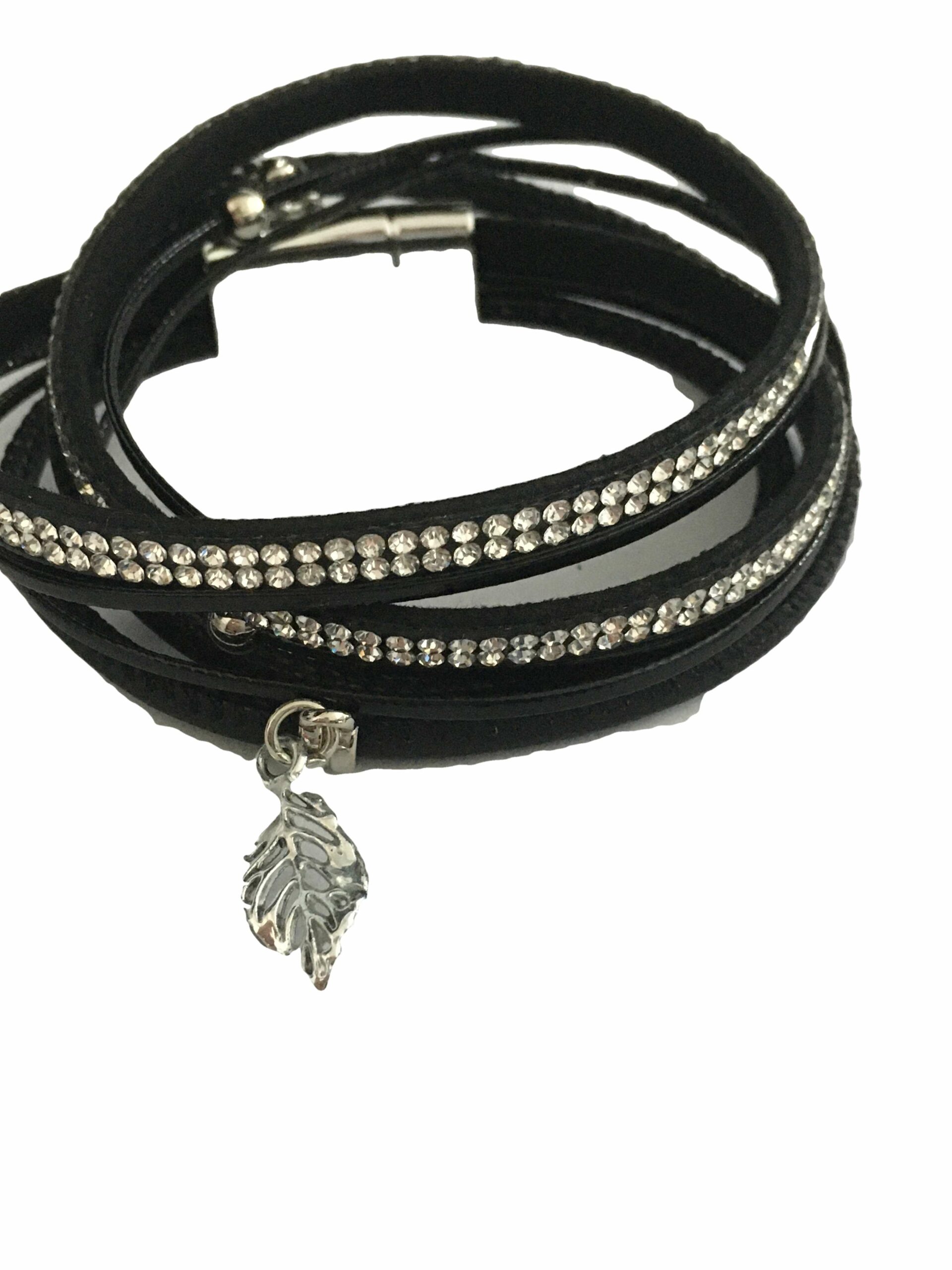 Een mooie leren wikkelarmband met een mooie magneetsluiting. De armband heeft verschillende strengen leer. De armband wikkelt twee keer om uw pols. De maat is ongeveer 39 cm. Meet uw pols alstublieft goed op, dit om teleurstellingen te voorkomen. De magneetsluiting is zilverkleurig en volledig nikkelvrij. Deze sluiting is erg makkelijk voor mensen met een fysieke beperking. Pas echter wel op met parfum, dit kan uitbijten en kale plekken achterlaten.